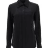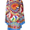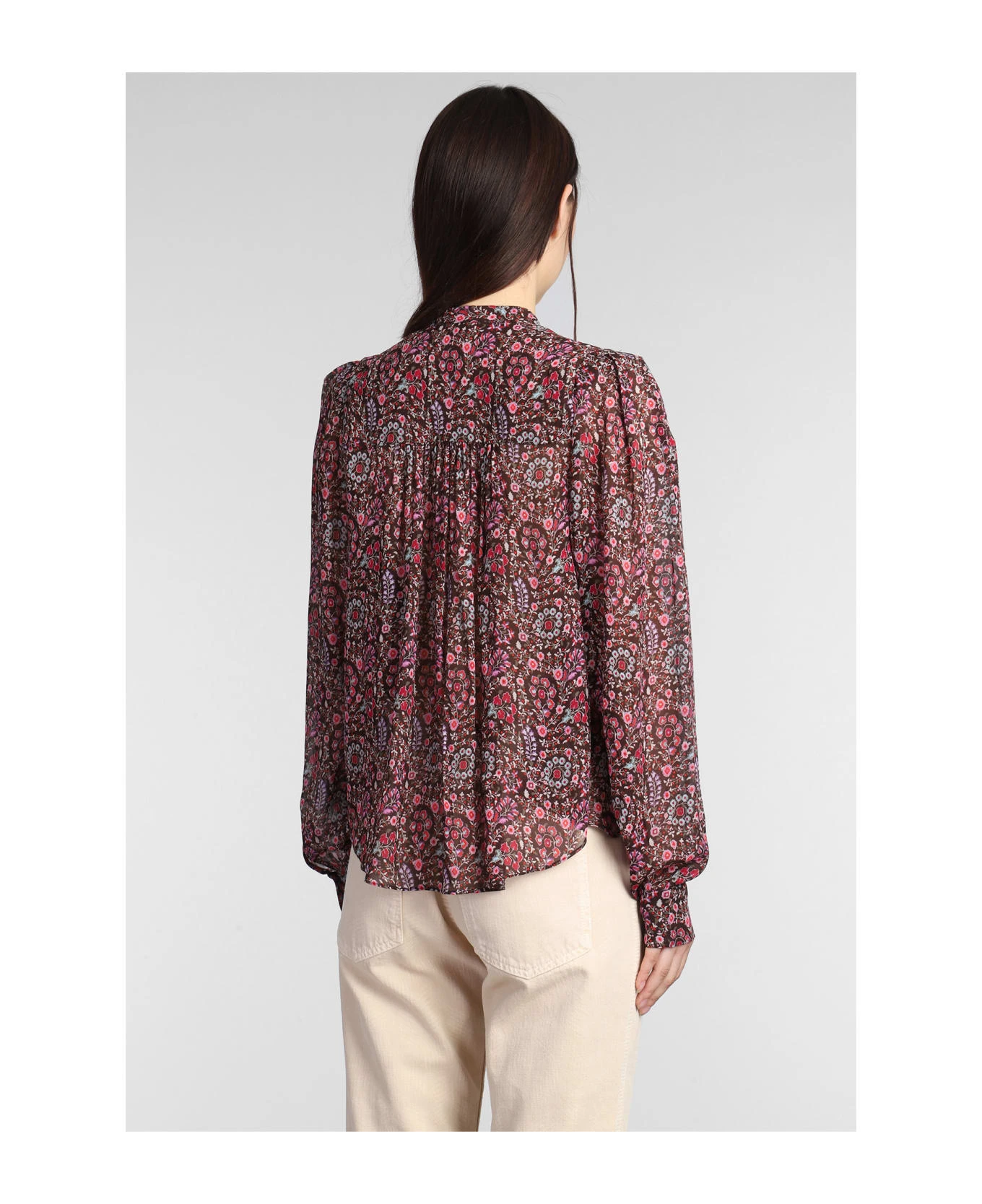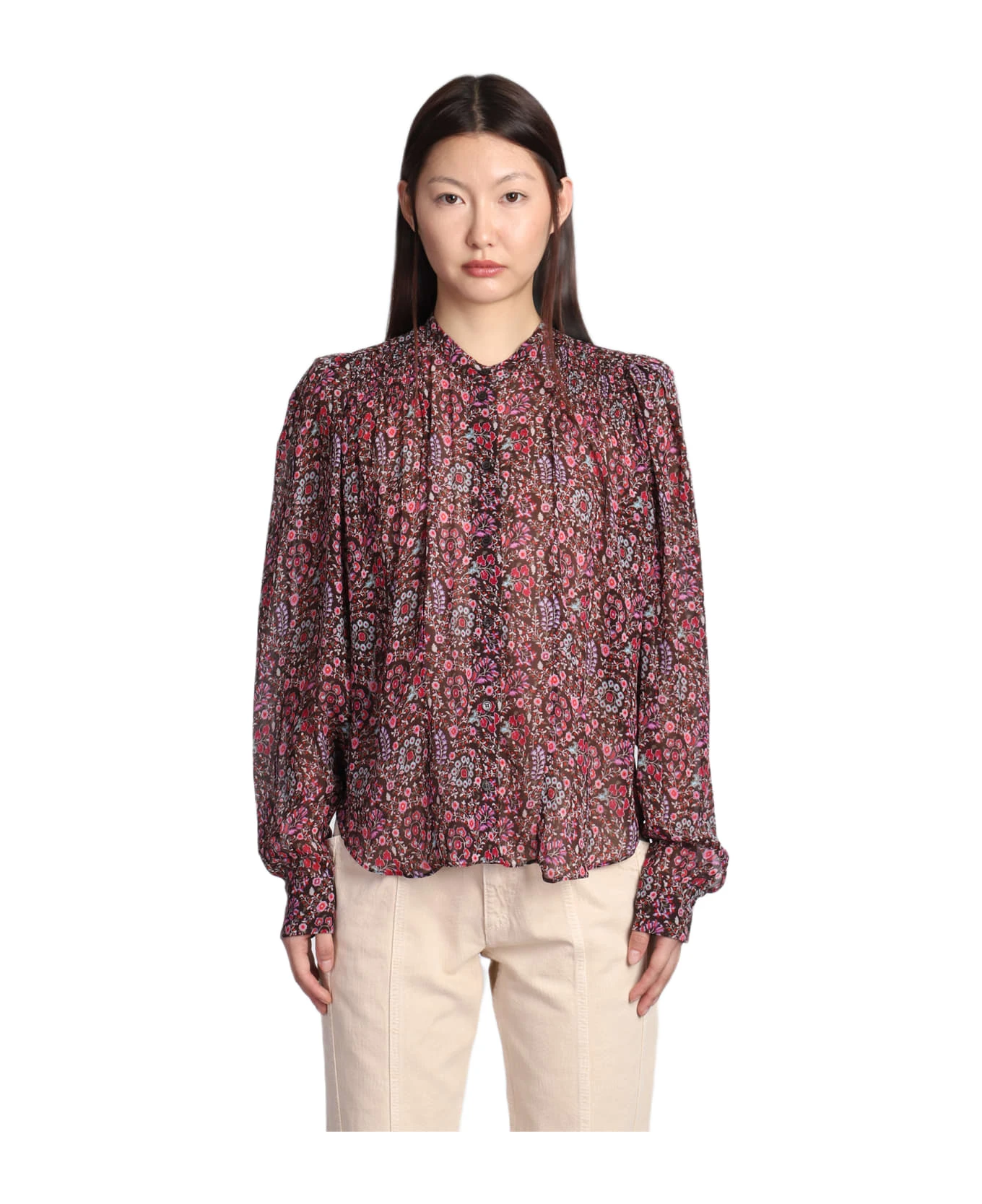 Noeline Blouse in brown viscose, long sleeves, mao collar, frontal buttoning, floral print, 100% Viscose, Made in India, Model is 1. 77 cm and wear size 38