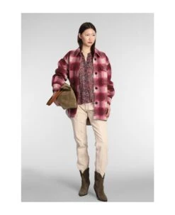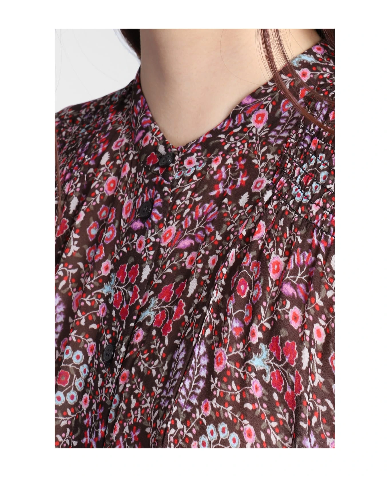 Noeline Topwear in brown viscose, long sleeves, mao collar, frontal buttoning, floral print, 100% Viscose, Made in India, Model is 1. 77 cm and wear size 38