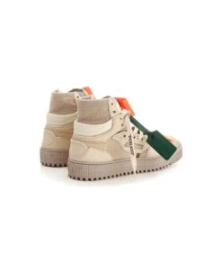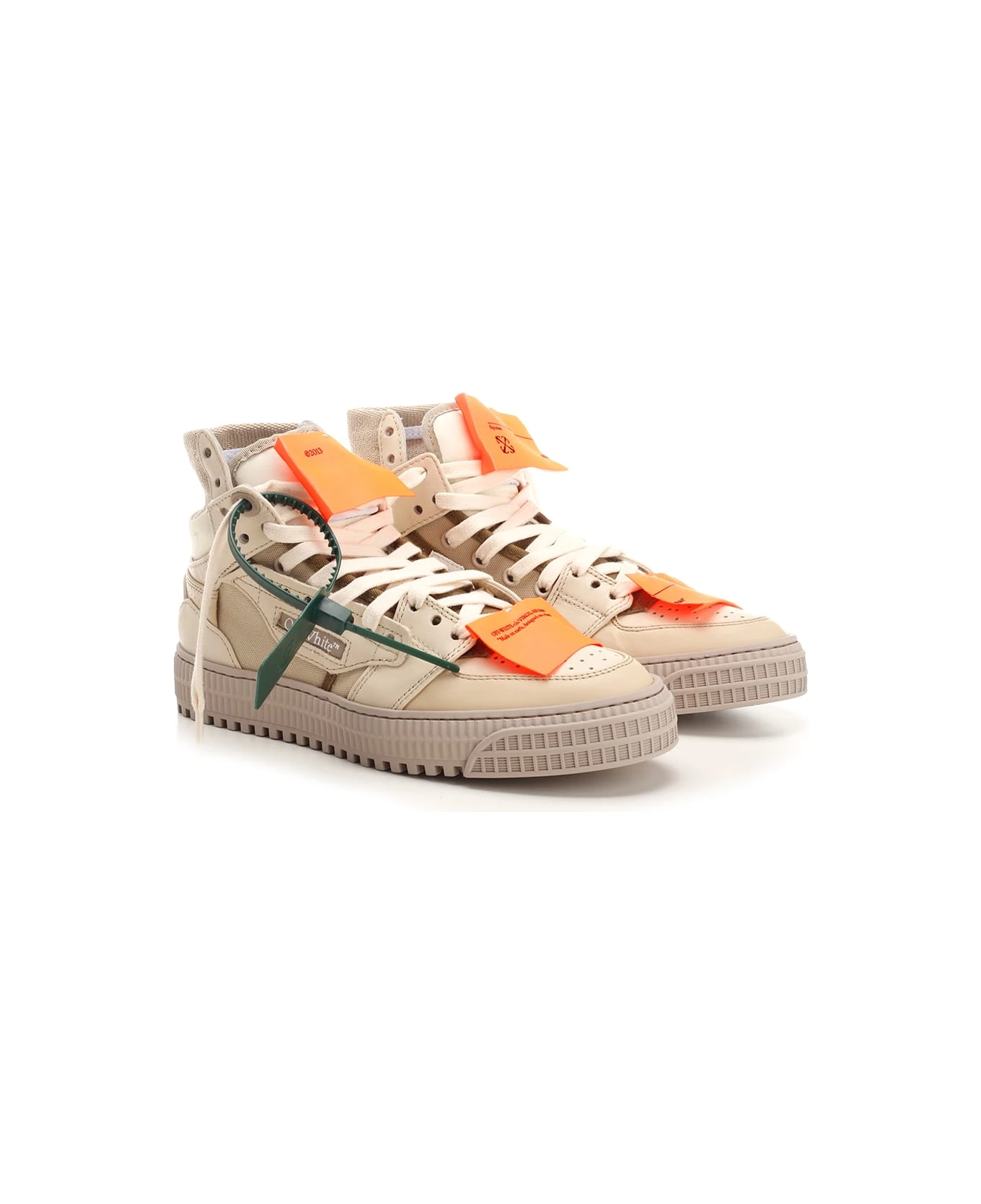 Beige ‘3. 0 Off-Court’ high-top sneakers with white Off-White logo and green Zip-Tie label on the sides. Orange labels with black writing on the front. Ecru finishes. Perforated tip. Rubber sole with grooves. Closure with laces and black ‘SHOELACES’ writing.