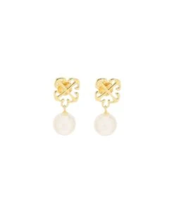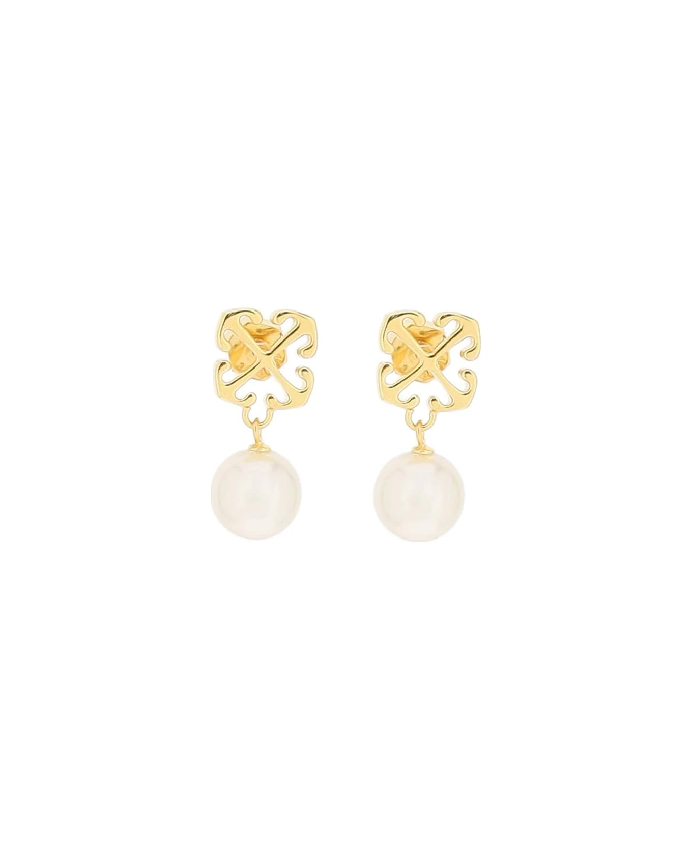 Off-White earrings made of gold-plated brass with Arrow motif and pendant pearl. For pierced lobes. Push-back closure.