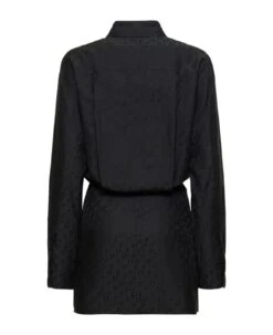 Black silk-cotton blend shirtdress, monogram jacquard, twist detailing, classic collar, front button fastening, long sleeves, thigh-length, straight hem