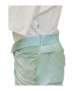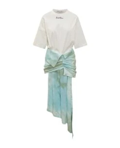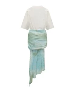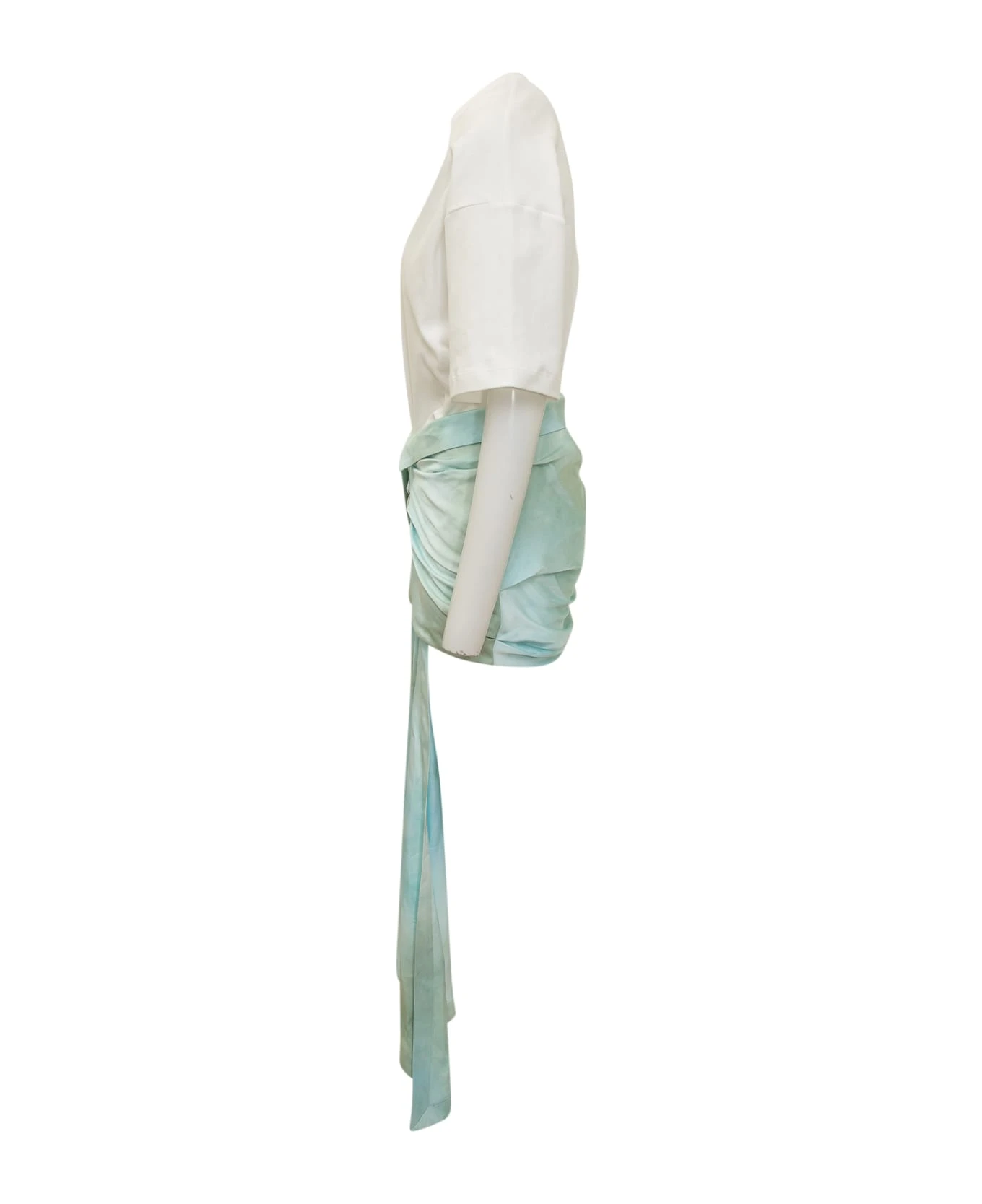 Mini dress. Short sleeves. Crewneck. Zip on the side. Draped tie-dye skirt. Train on the front.