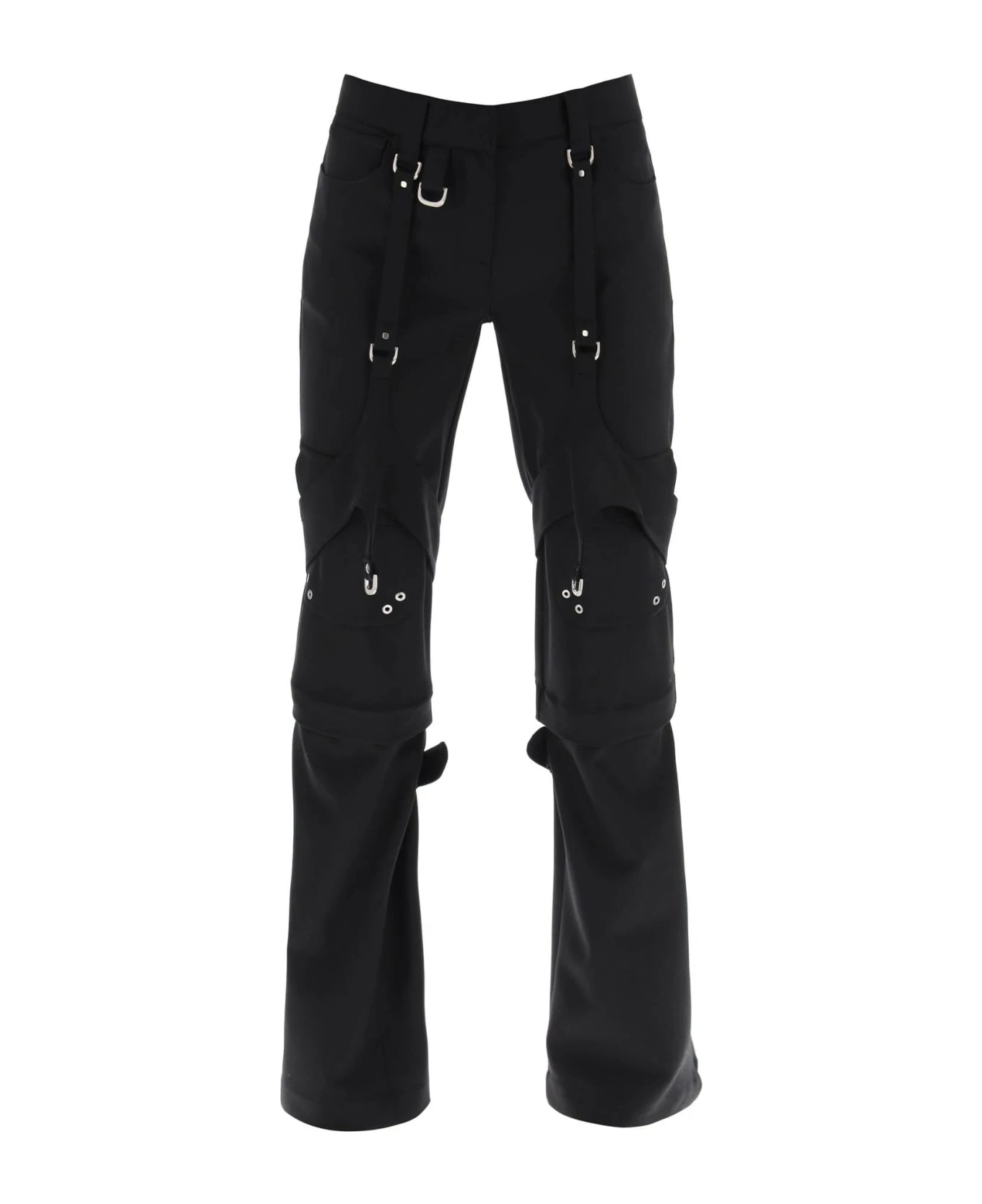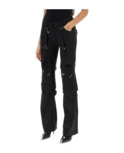 Off-White cargo pants crafted in wool blend twill with multi-pocket design. They features front fastening with zipper fly, hooks and button and belt loops on the waistband. Characterized by tonal straps and D-shaped silver-tone metal rings on legs. Slim fit with flared cut and low-rise waist. The model is 177 cm tall and wears size IT 38.