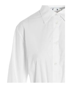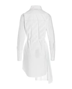 Diagonal’ cotton shirt dress with front button closure, asymmetric pleated detail, long cuffed sleeves and tone-on-tone print at the back.