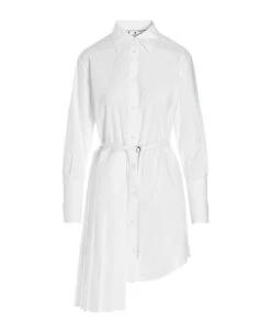 Diagonal’ cotton shirt dress with front button closure, asymmetric pleated detail, long cuffed sleeves and tone-on-tone print at the back.