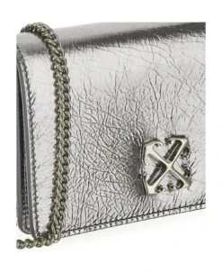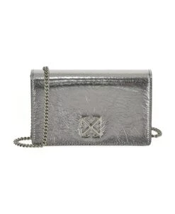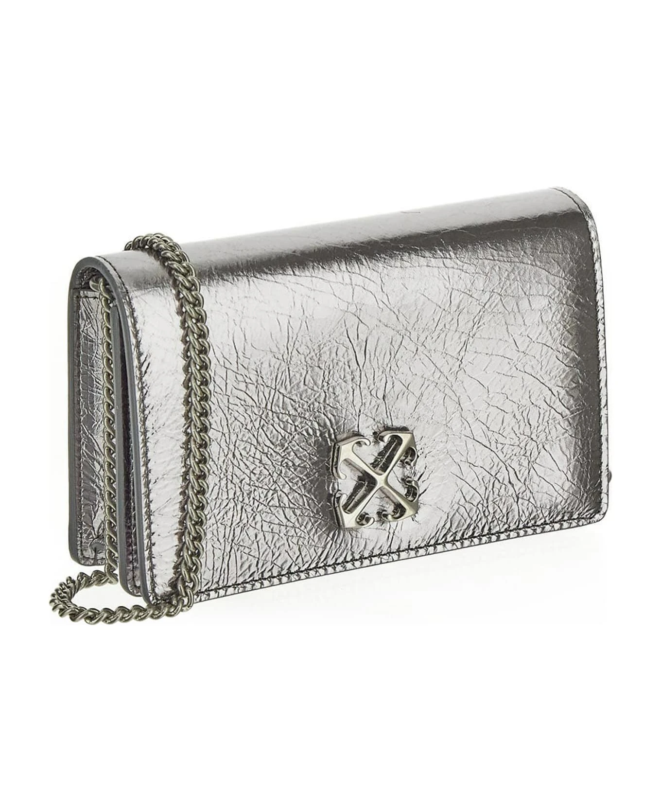 Off-White shoulder bag in lamina silver wrinkled leather with silver-finish metal Arrow logo plaque on the front, embossed black logo on the back, external back open pocket, detachable leather and chain shoulder strap, flap with magnetic closure, a main compartment, a zip pocket, a card slot and silver-toned metal hardware