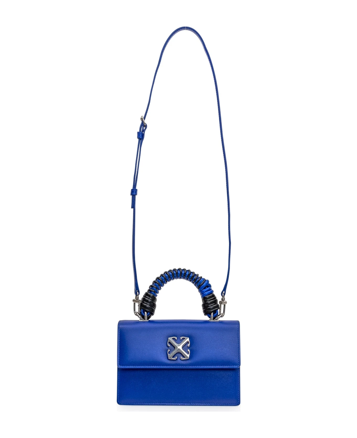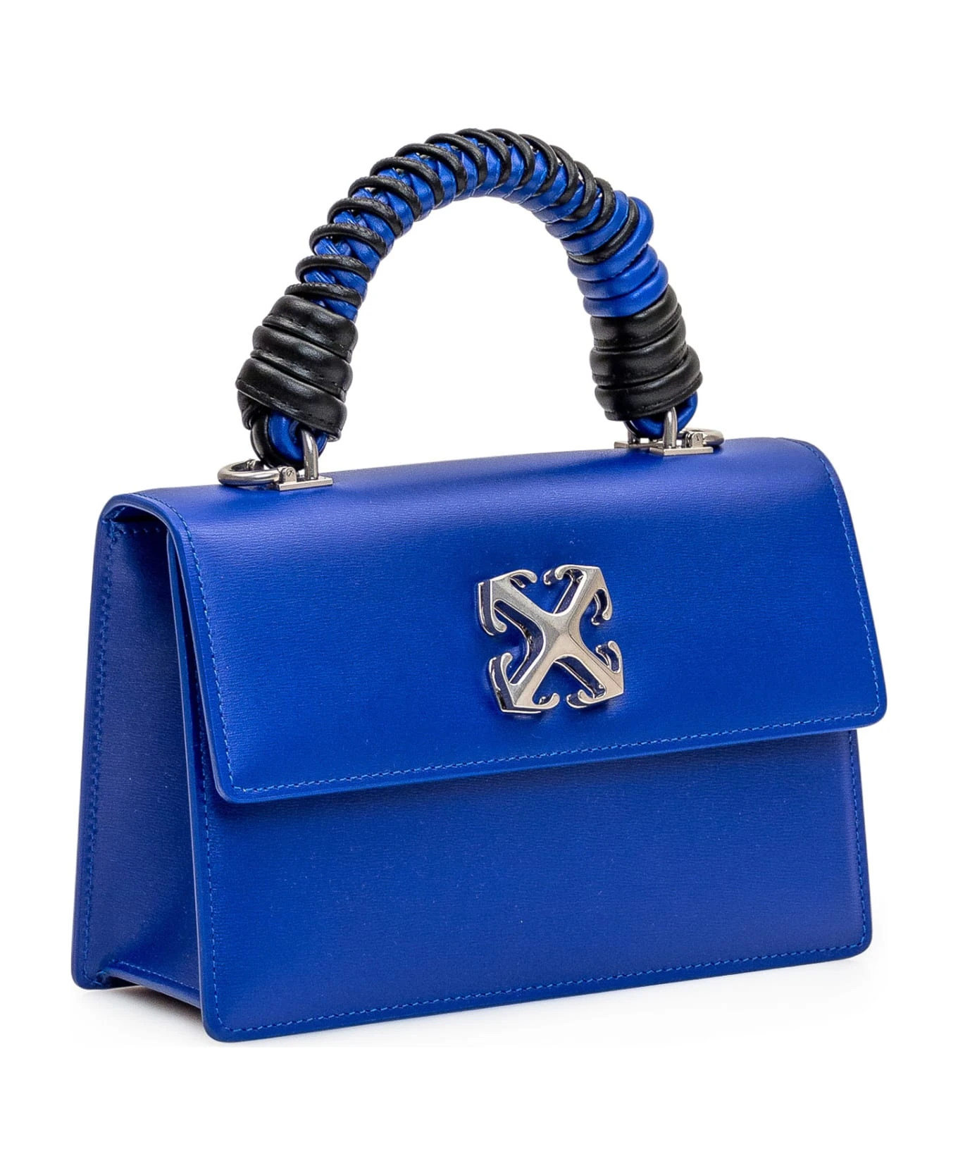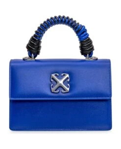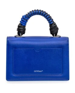 Blue leather handbag. One braided handle. Adjustable and removable shoulder strap. Inside zip pocket. Two internal compartments. External pocket on the back. Hinged with snap closure.