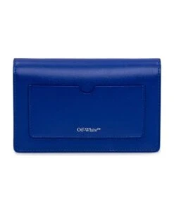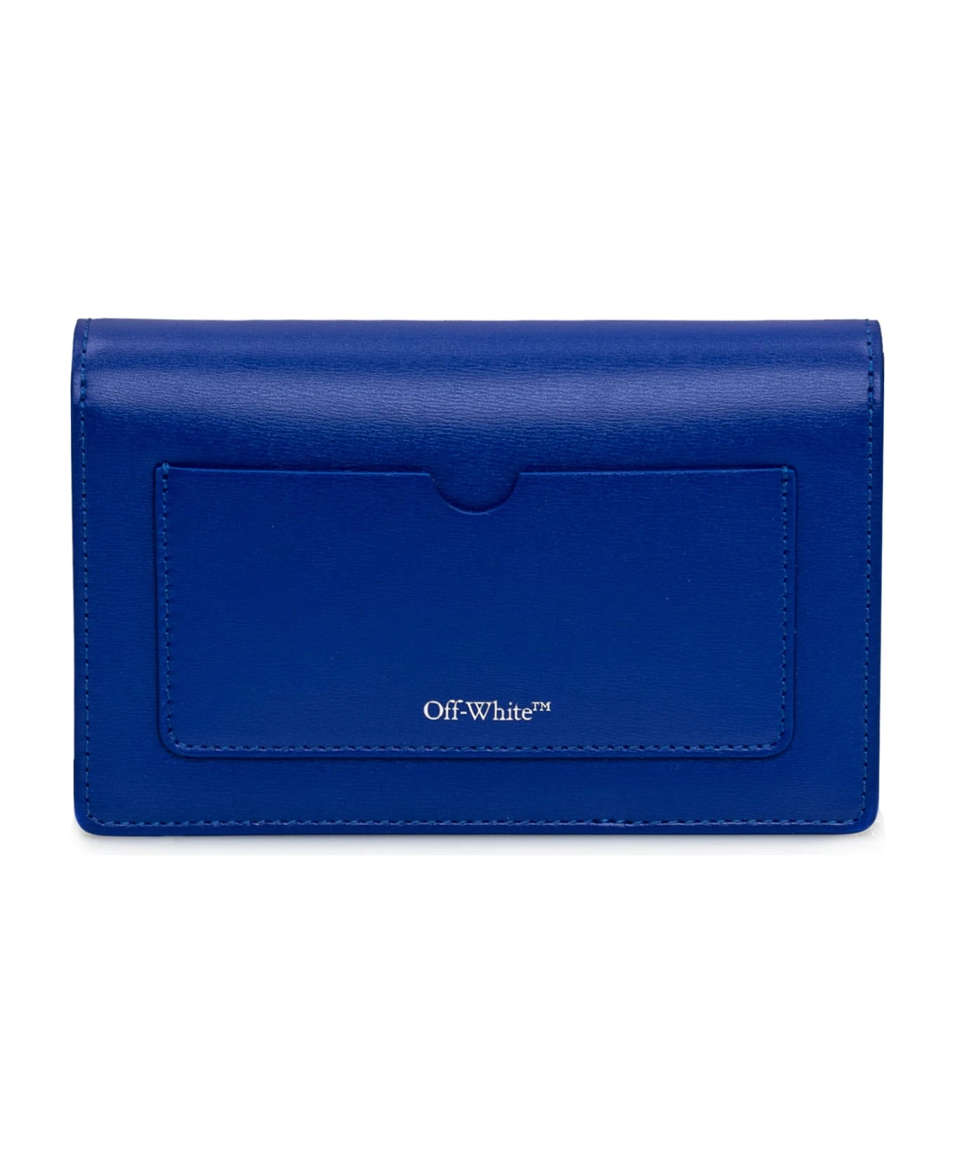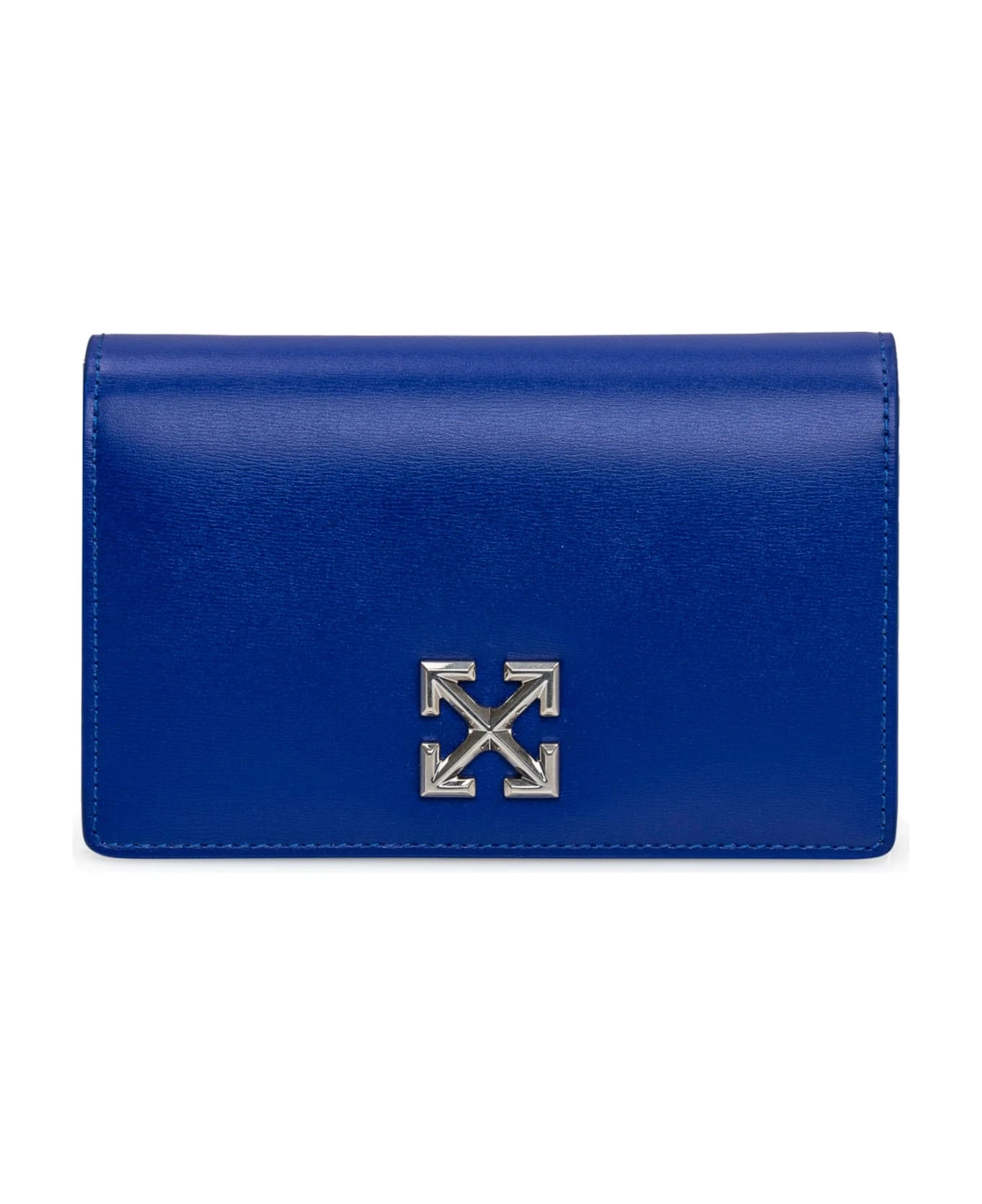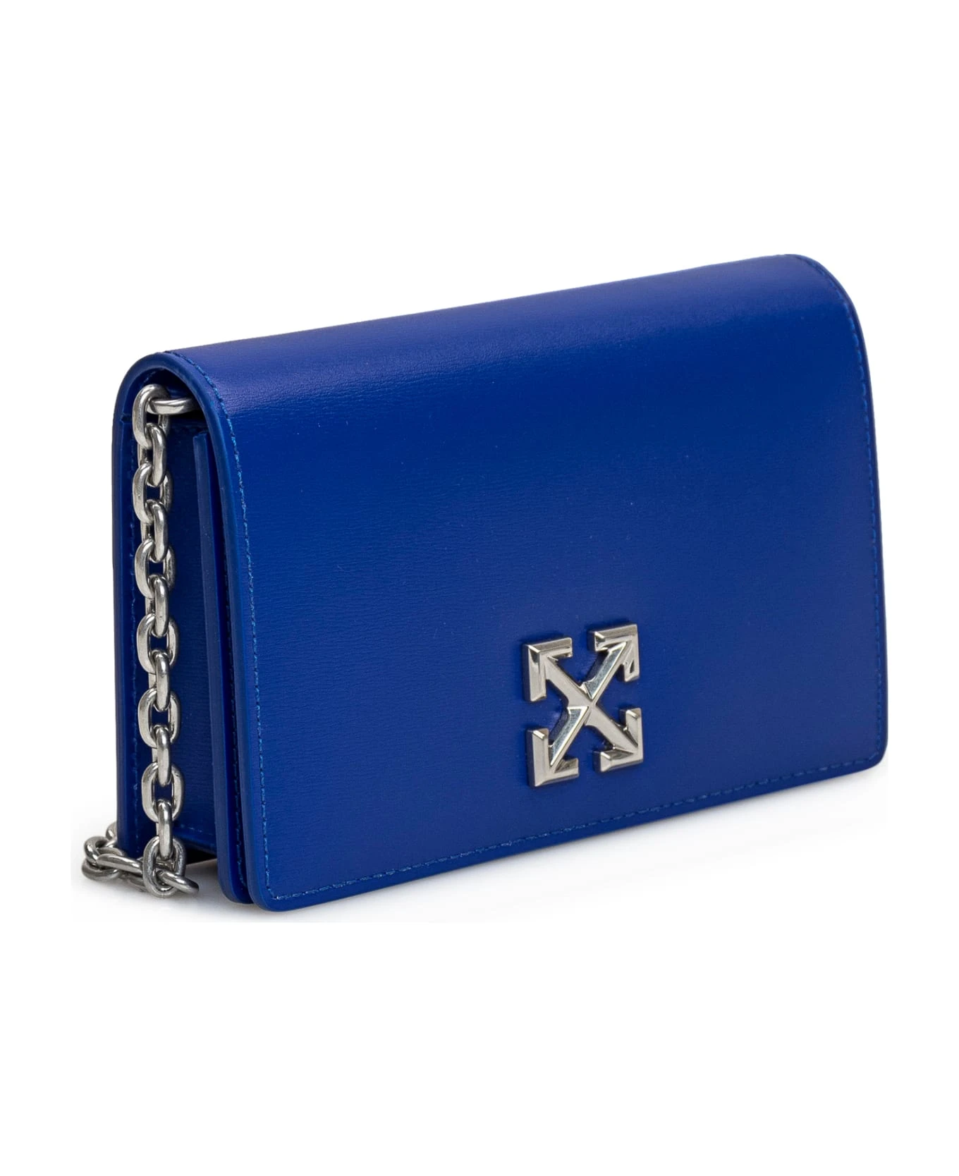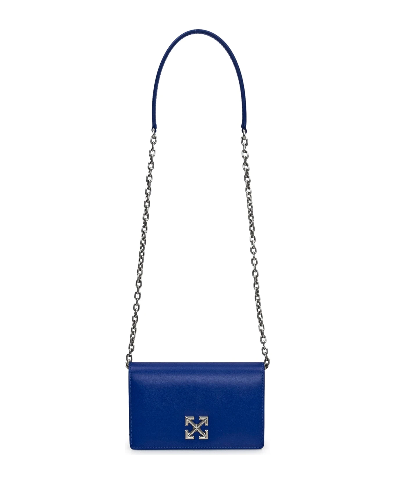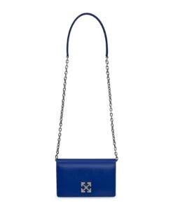 Blue shoulder bag. Chain strap. Closure with flap and button. Metal Arrow on the front.