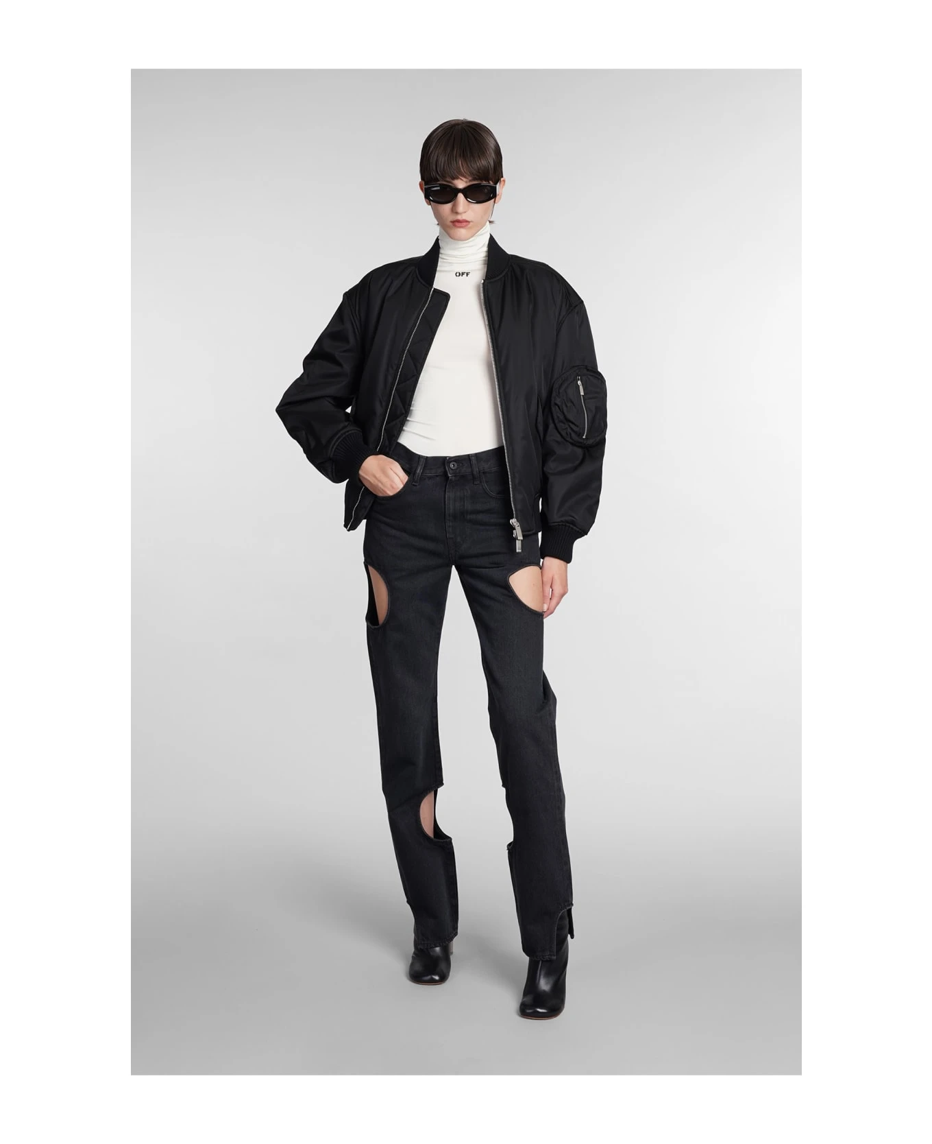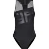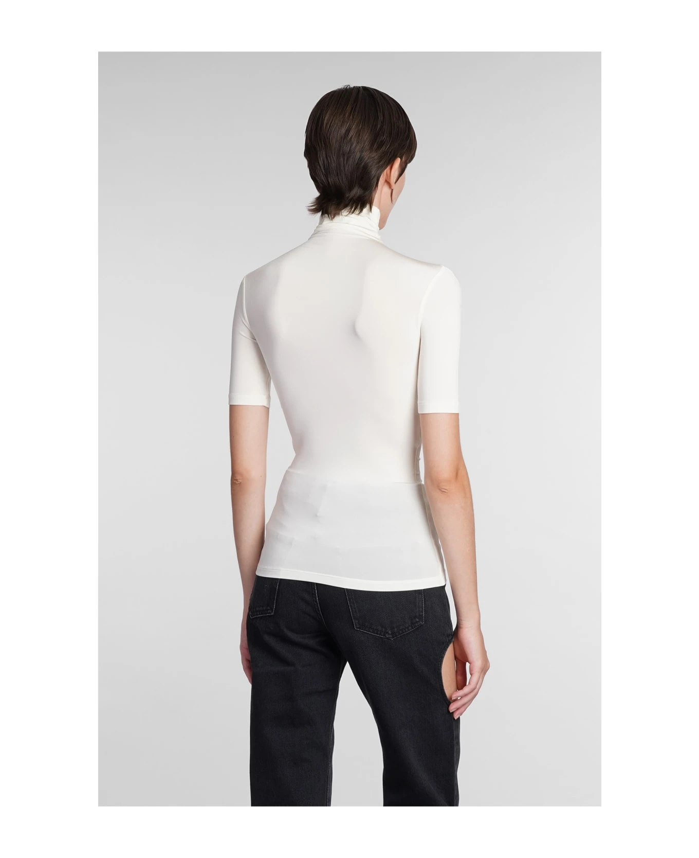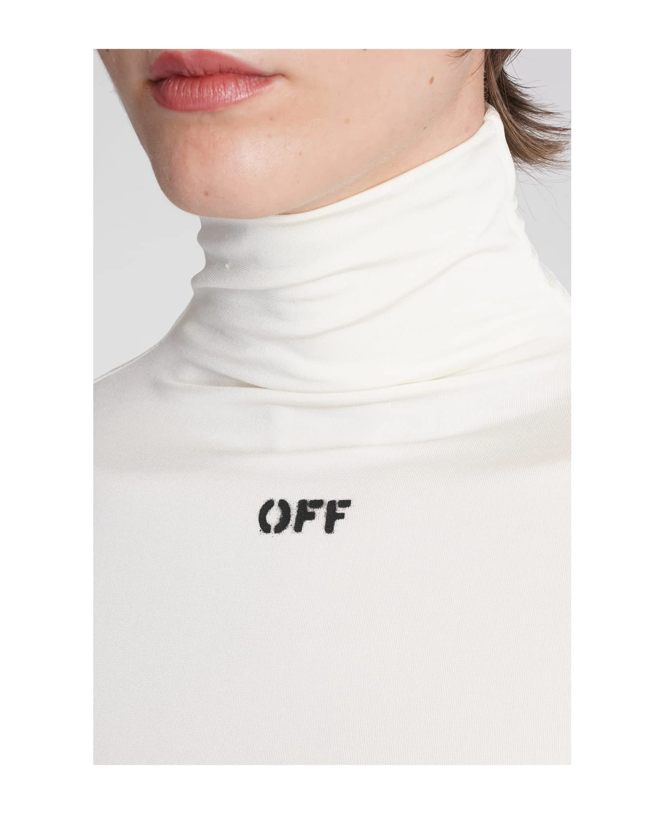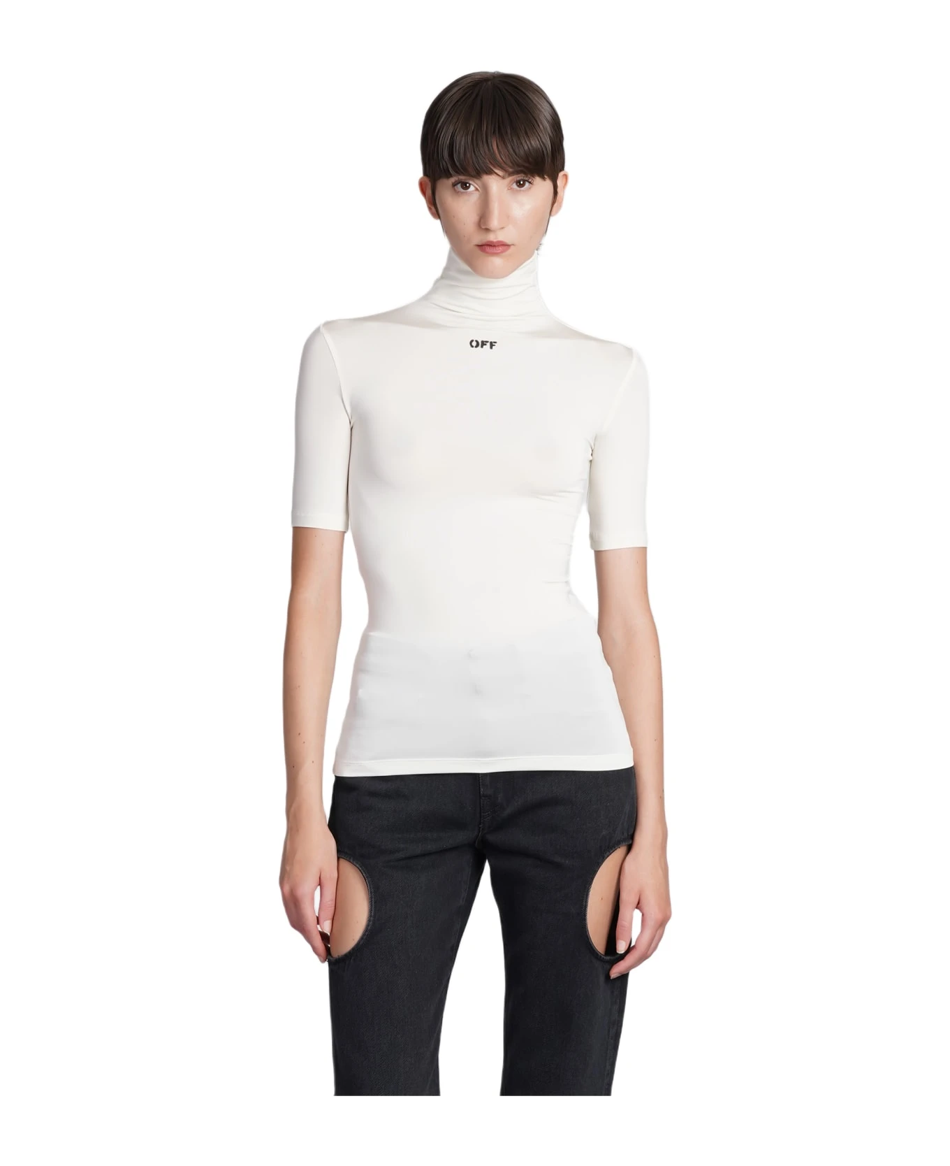 Knitwear in white viscose, high collar, short sleeves, logo printed, 95% viscose, 5% Elastan, Made in Italy, model is 180 cm and wears size 40