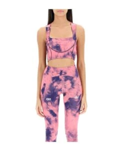 Sports bra from the Athleisure line by Off-White, made of stretch technical jersey with tie-dye motif and “Off” contrasting logo print on the shoulder-straps. It features wide square neckline and flat-stitching details shaping the silhouette. Slim fit. The model is 177 cm tall and wears a size XS.