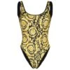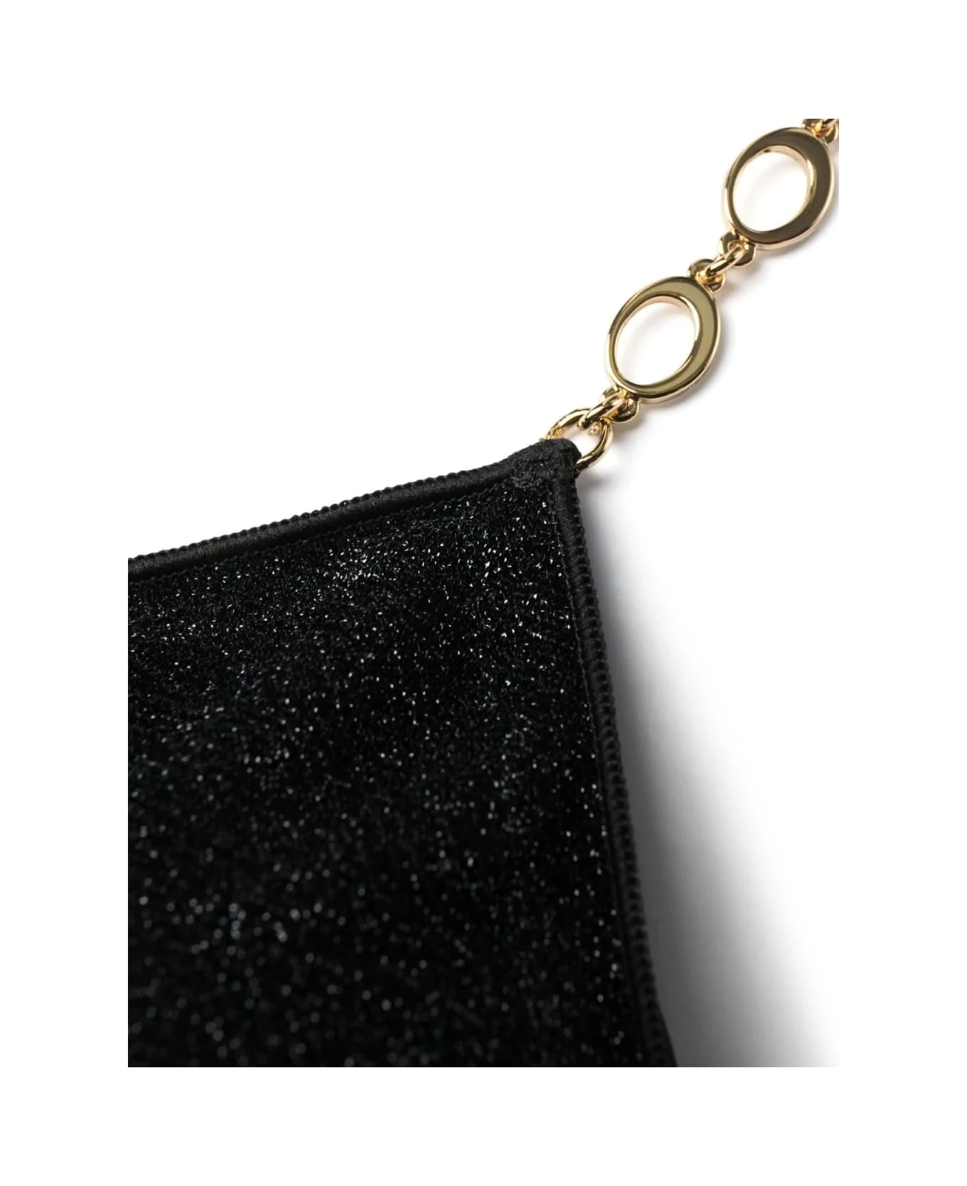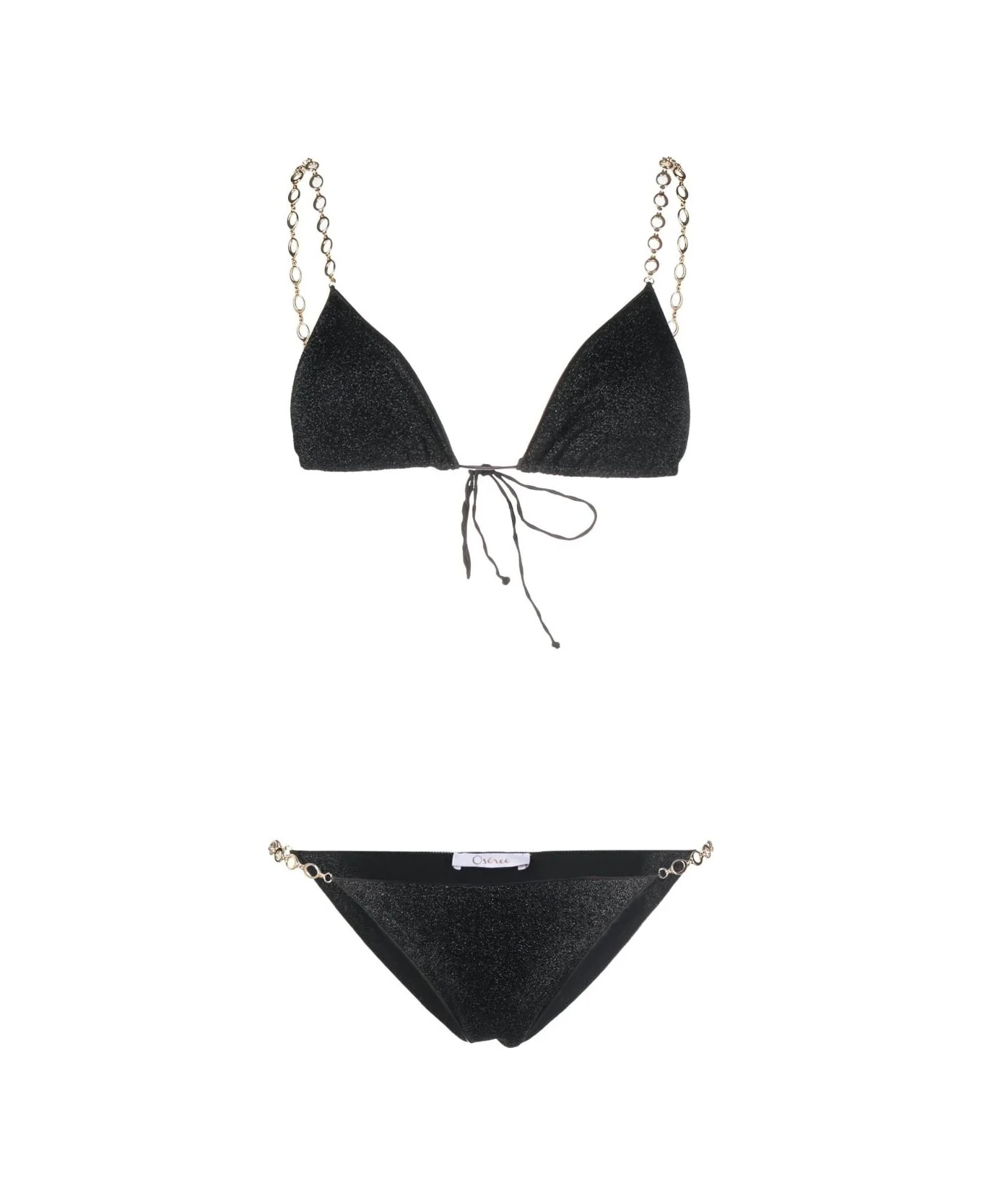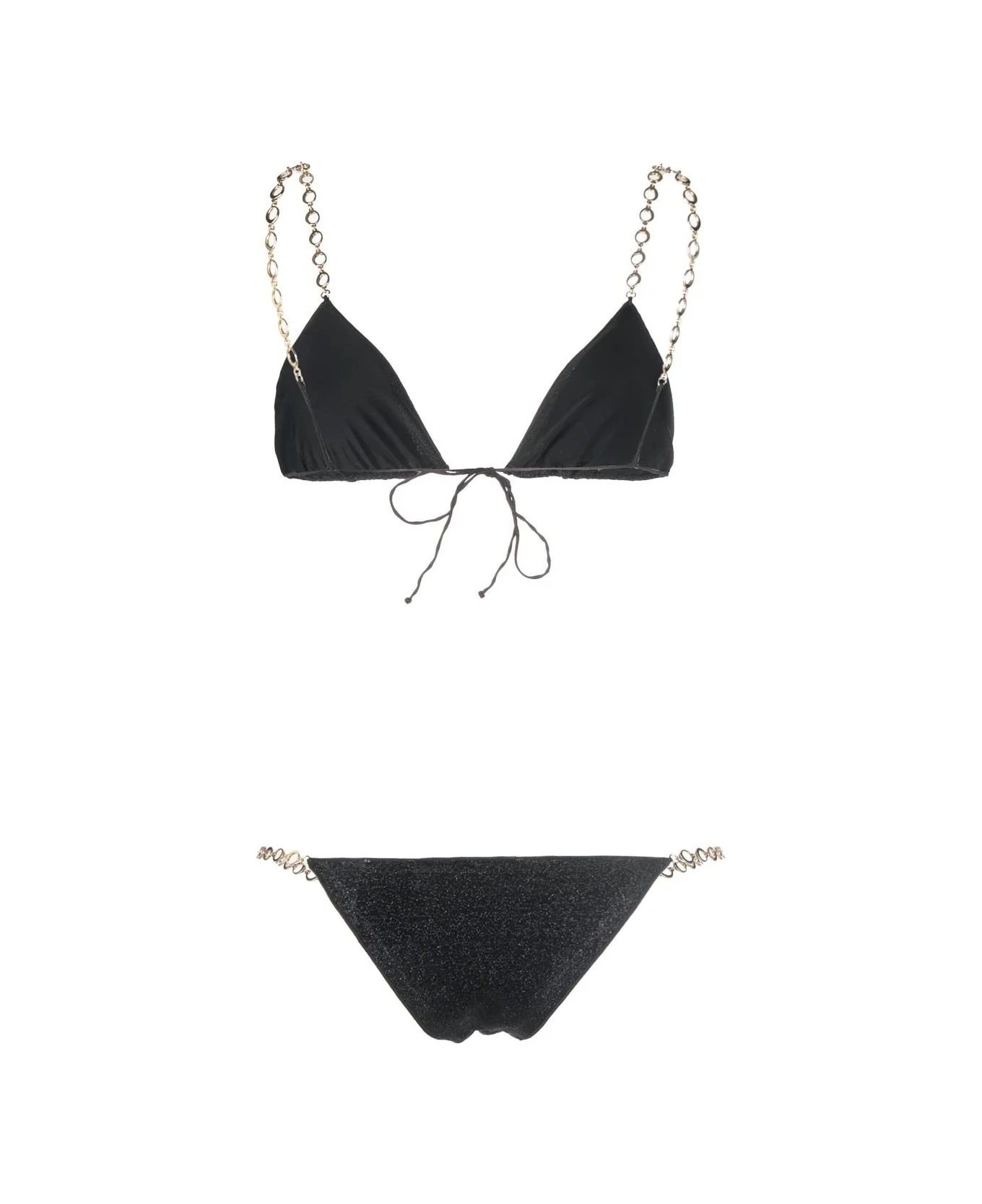 Lumiere bikini by Oseree made from black lurex fabric and comprising briefs with side chain and unpadded triangle top with chain straps and back fastening. Metallic parts with gold finish.