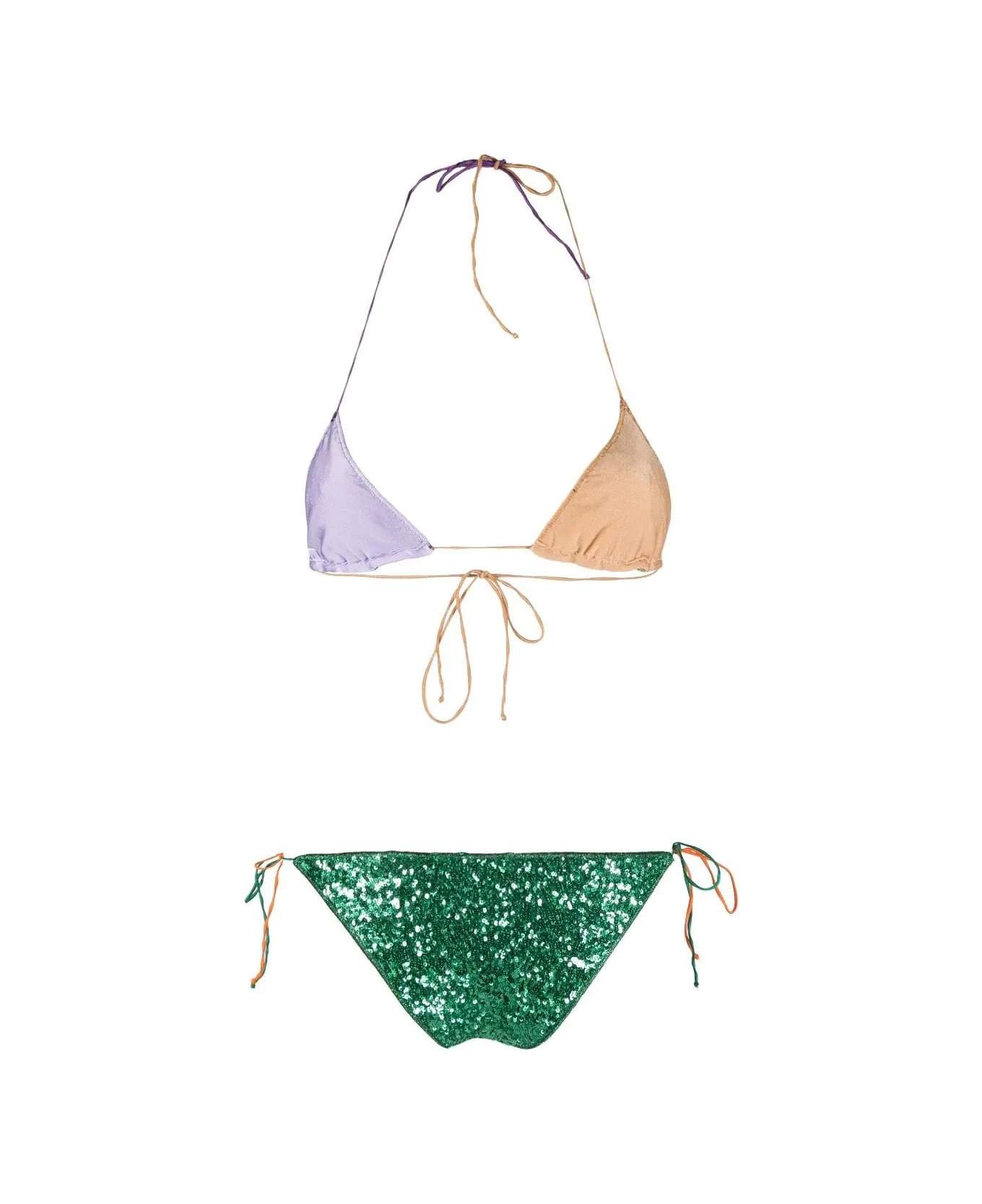 Multicolor microkini by Oseree made of fabric entirely covered in small sequins and consisting of a brief with side ties and triangle top with back fastening.