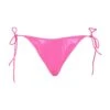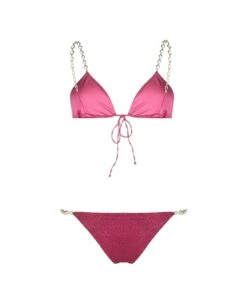 Lumiere bikini by Oseree made from raspberry-coloured lurex fabric and comprising briefs with side chain and unpadded triangle top with chain straps and back fastening. Metallic parts with gold finish.
