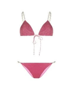 Lumiere bikini by Oseree made from raspberry-coloured lurex fabric and comprising briefs with side chain and unpadded triangle top with chain straps and back fastening. Metallic parts with gold finish.