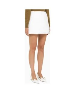 White padded cotton skirt by Prada, featuring stitched logo on the front and mini length.