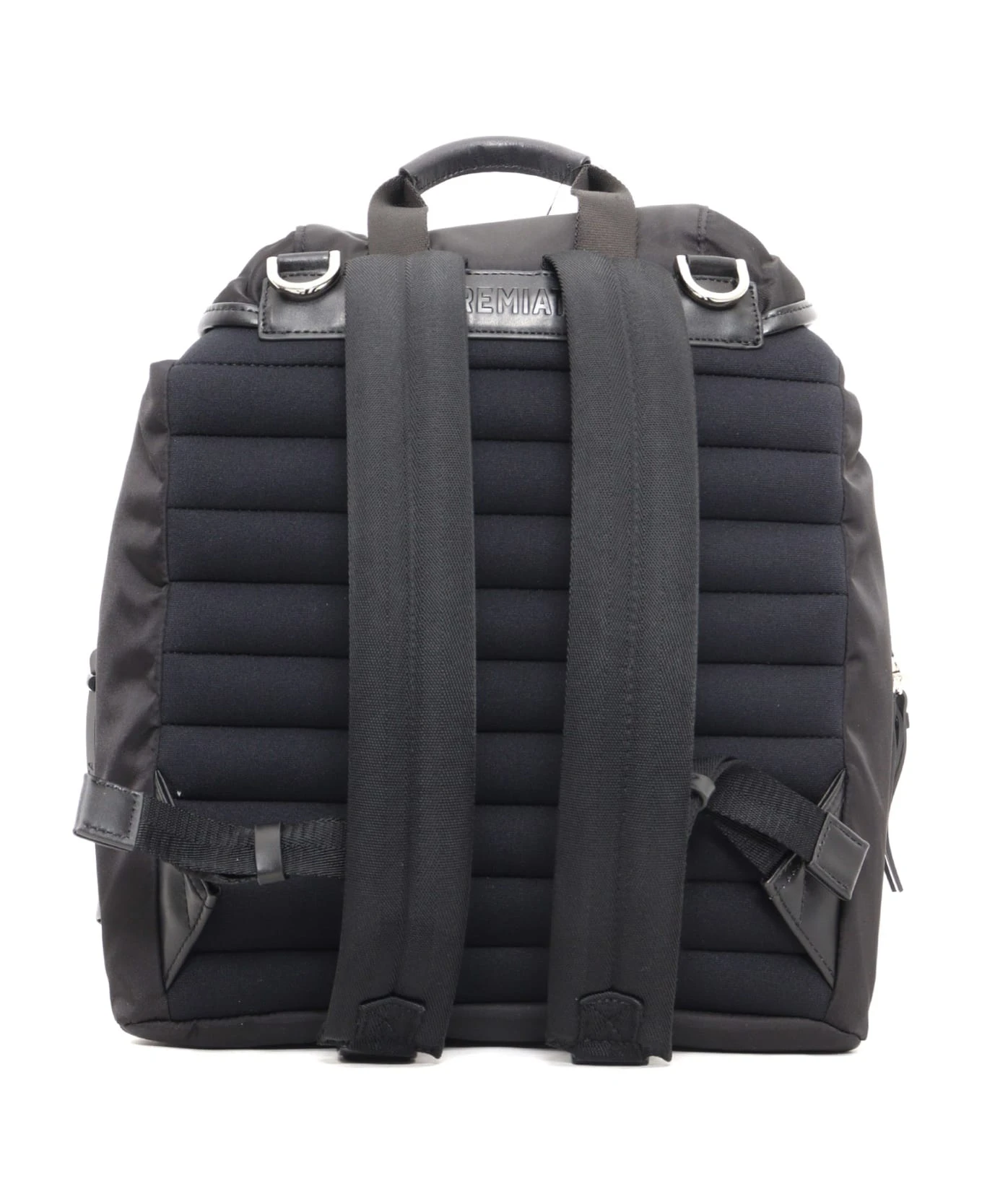 Nylon gabardine backpack, padded back, adjustable shoulder straps with EVA lining, lower zipped pockets, embossed calfskin shoulder strap, waterproof zip, invisible zipped pocket and rubber puller with logo, gabardine lining with logo, rubber puller, internal cotton drawstring, matte black hardware, calf leather finish, matte black metal hook, padded back, side zip pocket