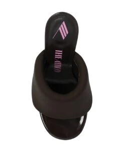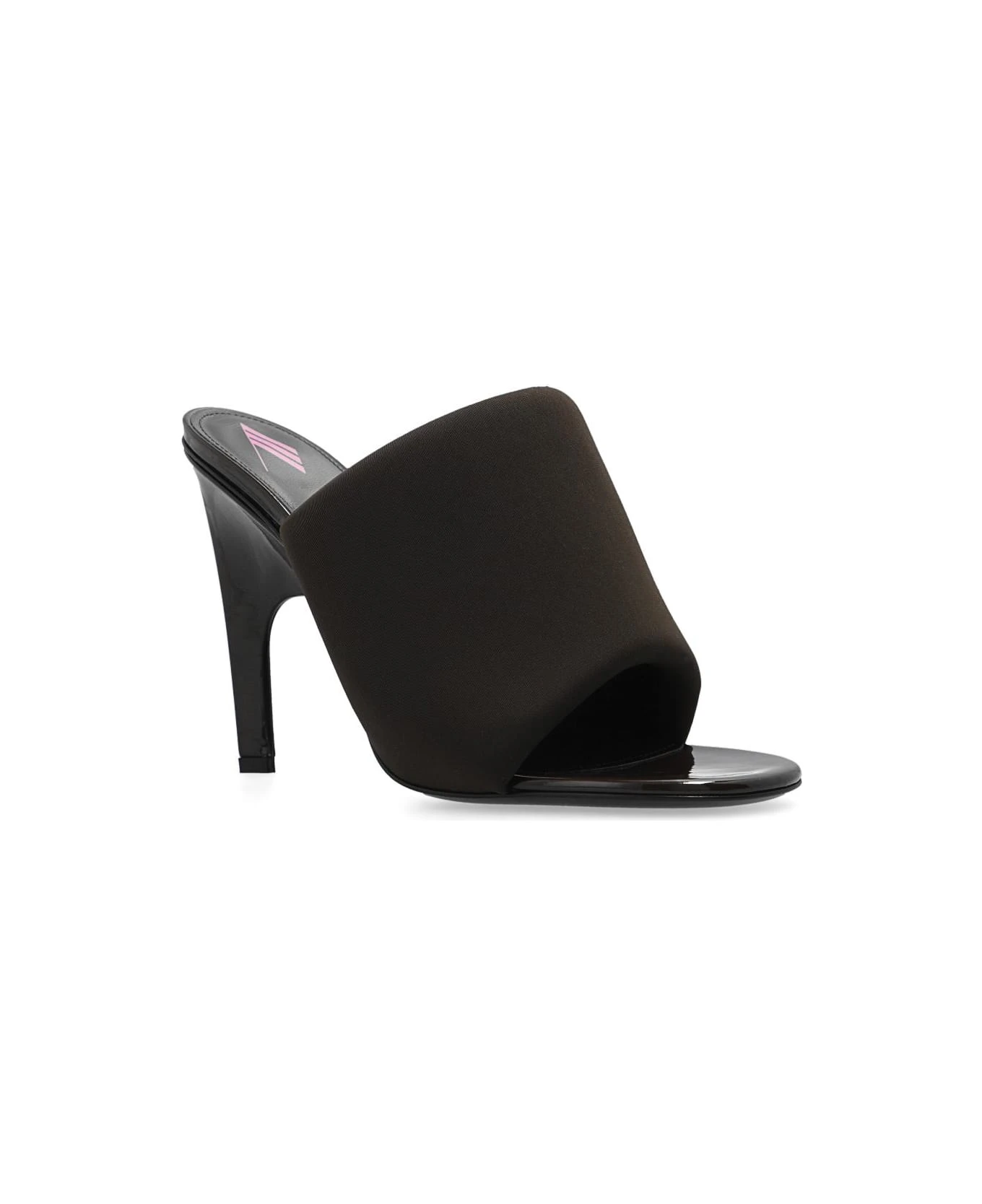 Brown ‘Rem’ heeled pumps from The Attico. Made of fabric and leather, this pair features a pink logo print and black leather sole.