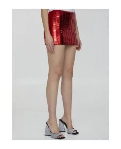 Rue miniskirt in red rectangular sequins. Low-waist and rear zip closure.