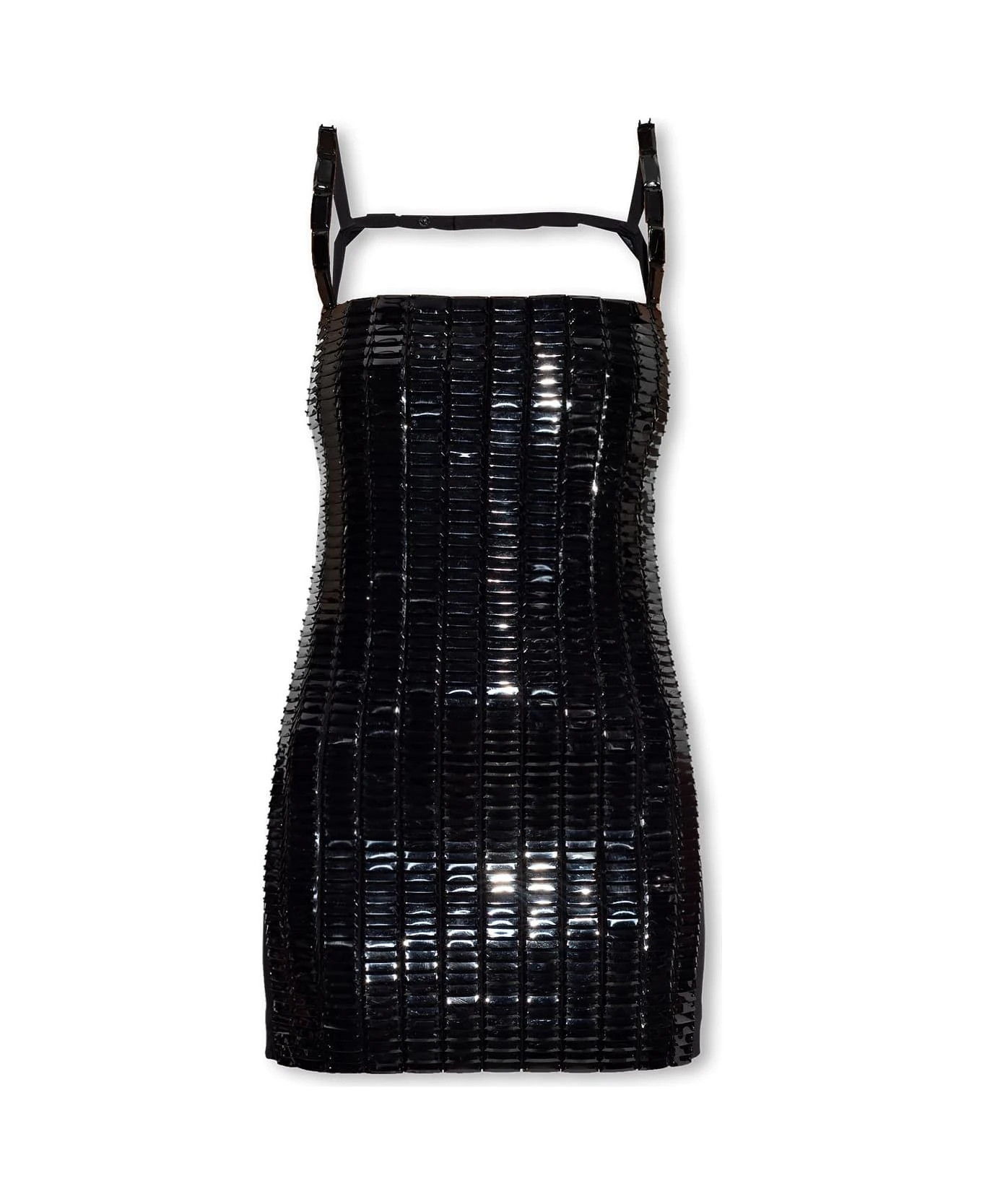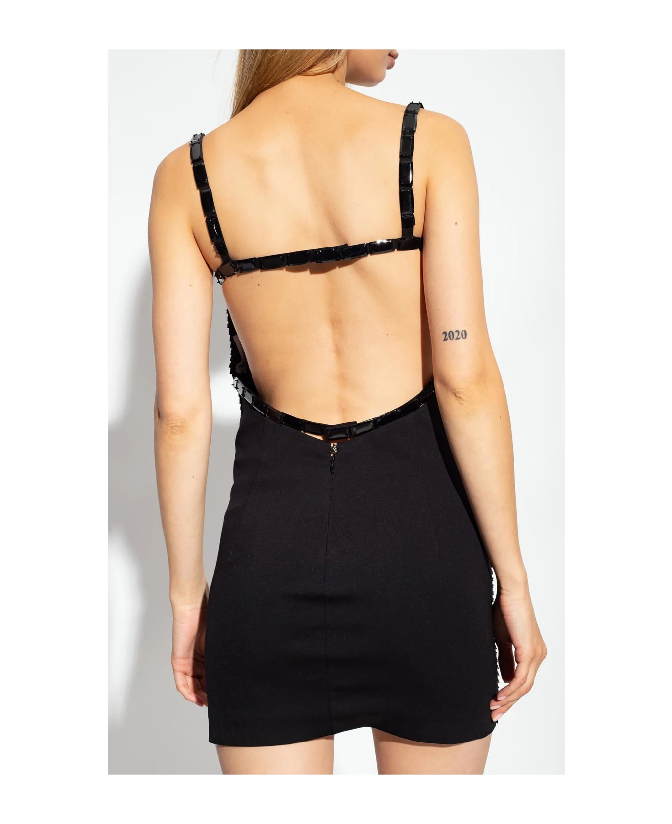 Black ‘Rue’ mini slip dress from The Attico. Spruced up with glistening sequins on the front, this style fastens with a hidden zipper, hook & eye closure and snaps at the back and features a square neckline and a denuded back with thin straps.