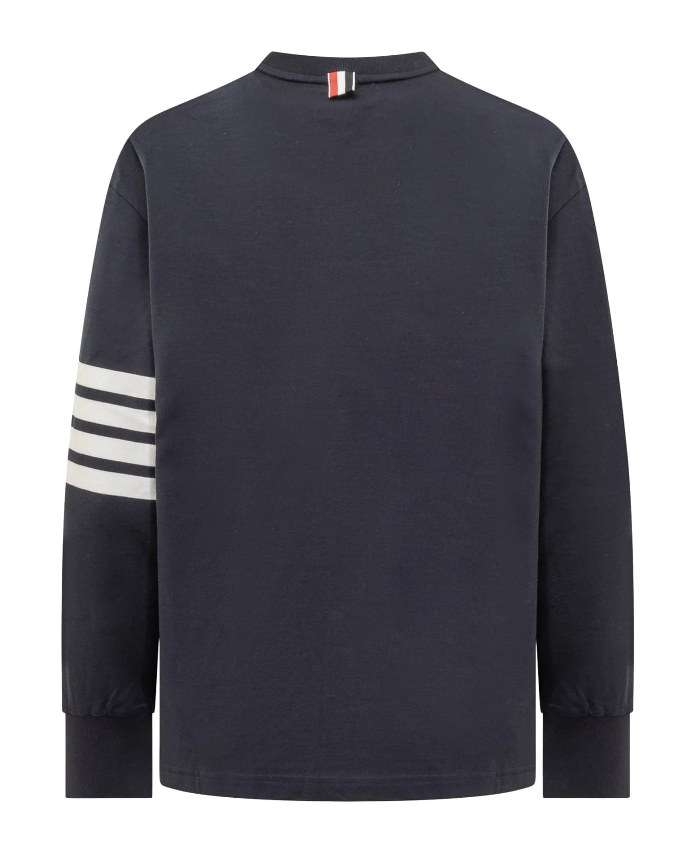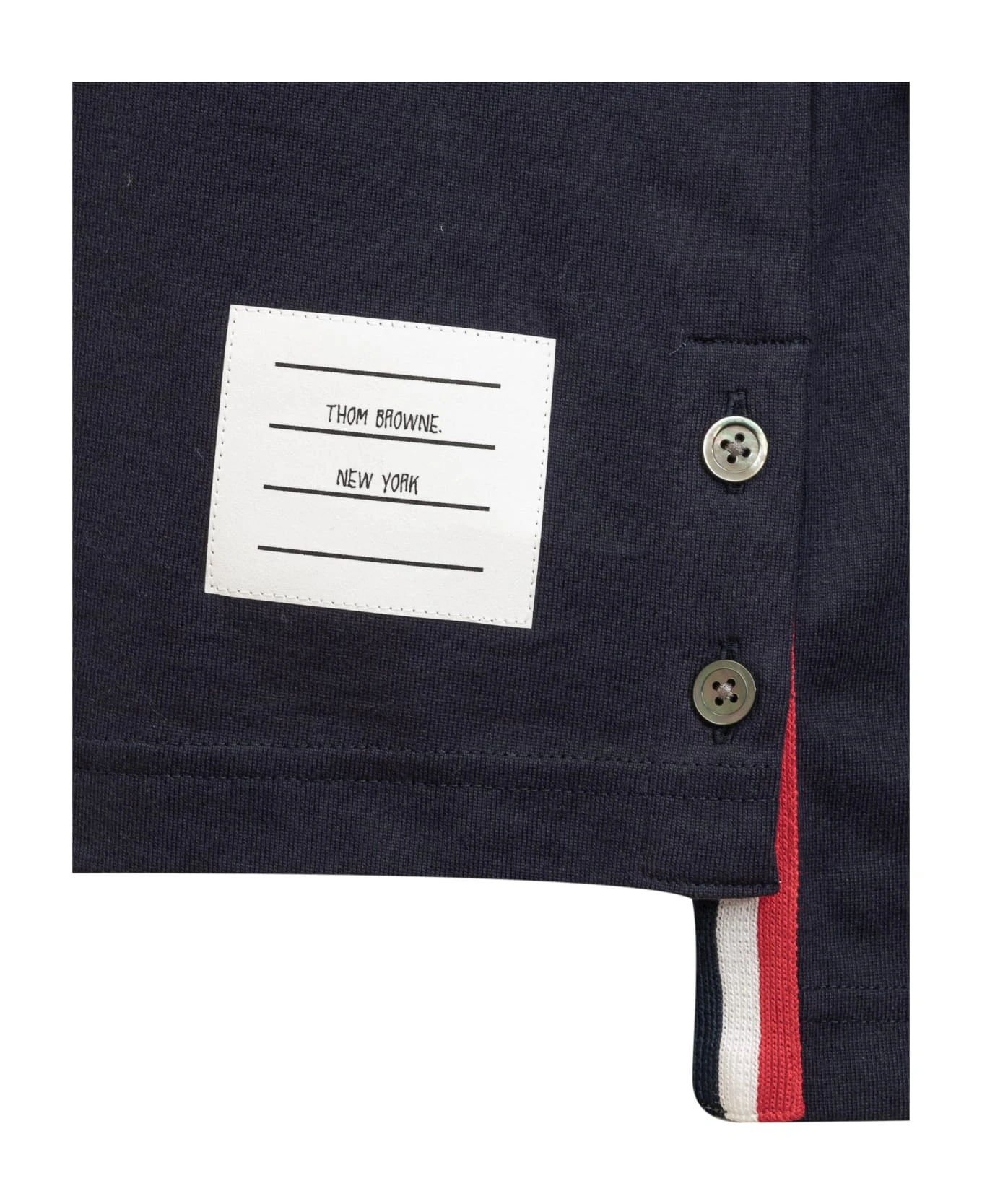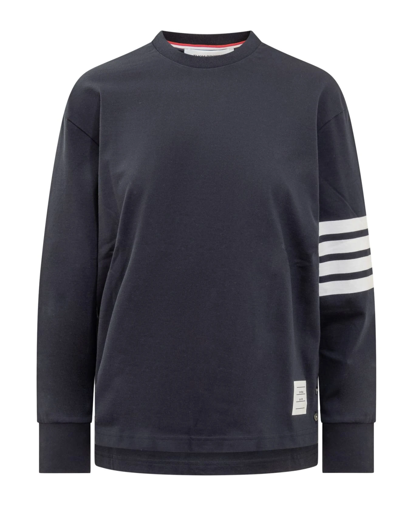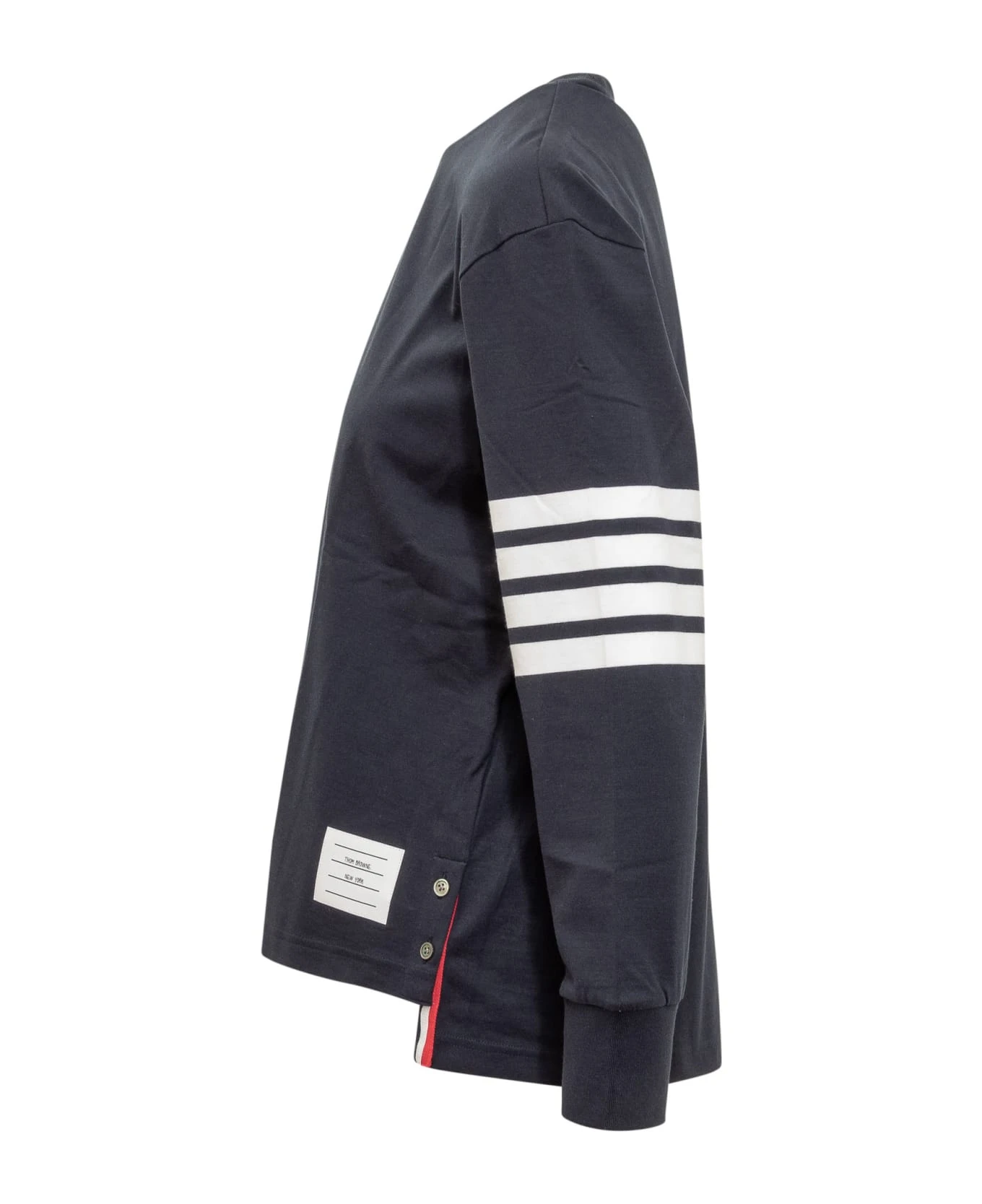 Long-sleeved jersey. Crew neck. Ribbed cuffs. Side buttons. Longate bands on sleeve. Logo tag on bottom.