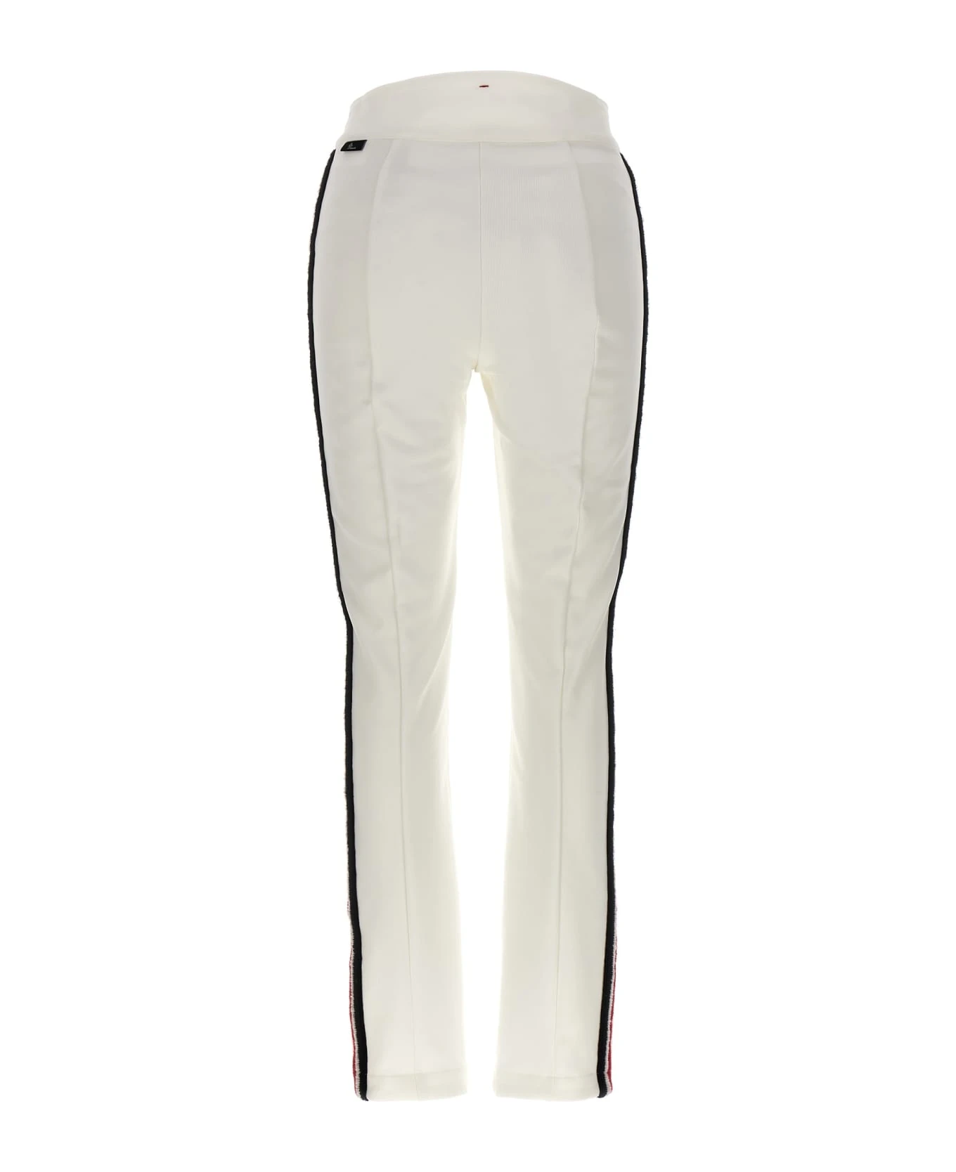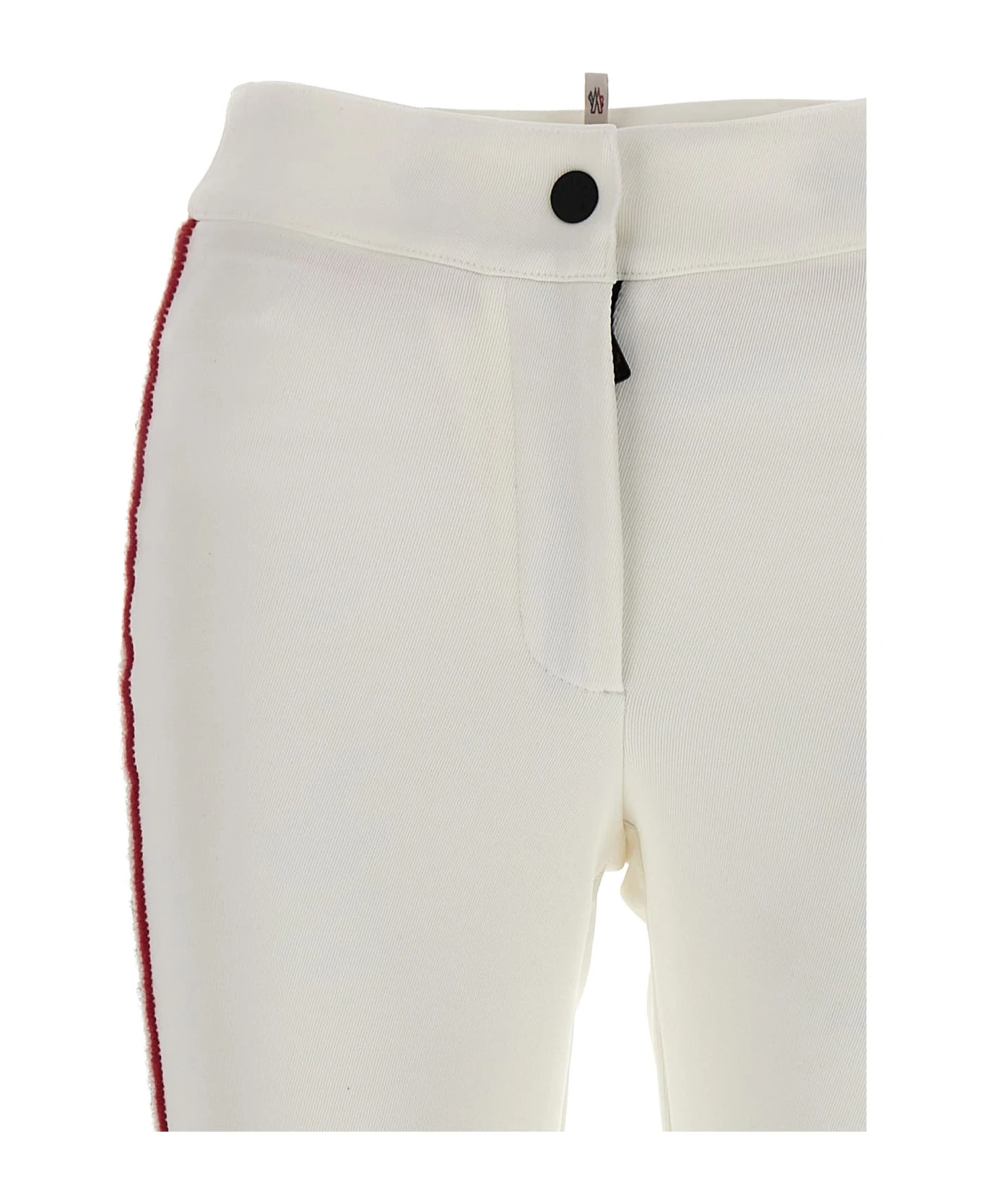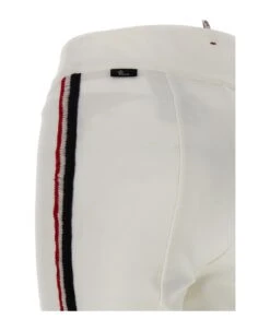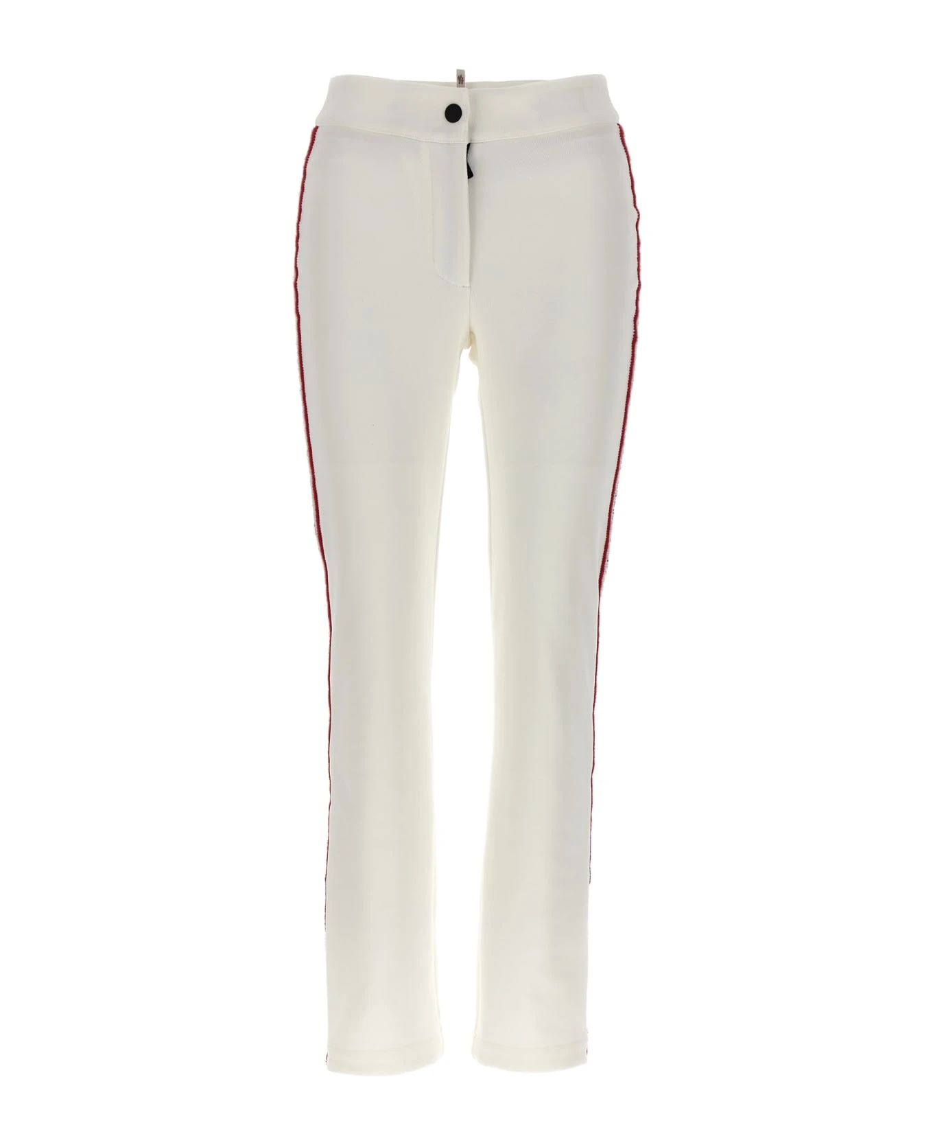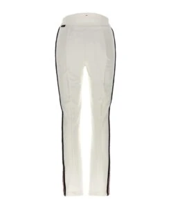 Stretch knit pants with contrasting side embroidery, high waist, skinny style with zip and button closure.