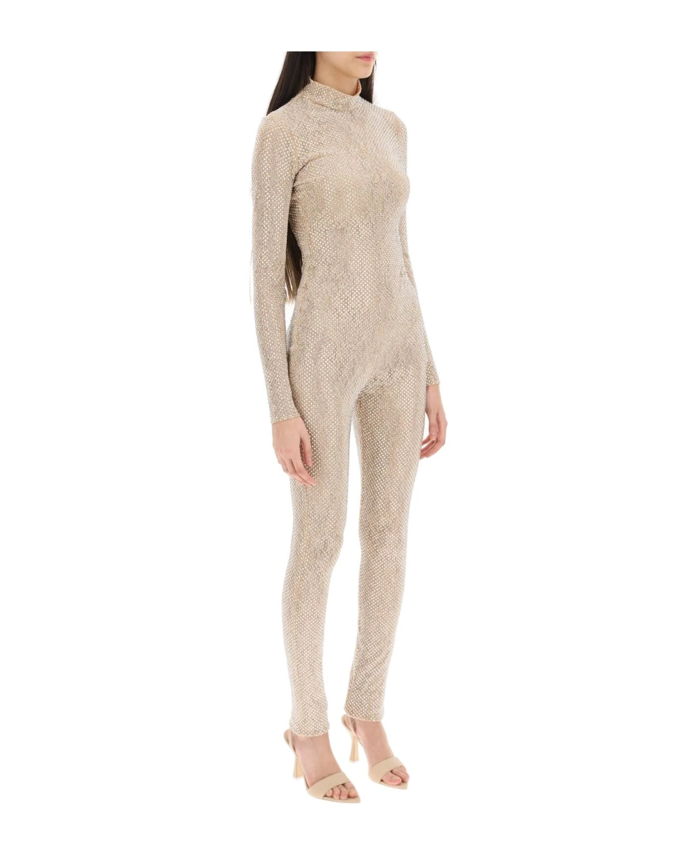 Stella McCartney floral lace jumpsuit entirely covered with rhinestones. Shaped to a second-skin fitted silhouette, it features long sleeves, mock neck, and invisible zippers at the back and ankles. The model is 177 cm tall and wears a size IT 40.