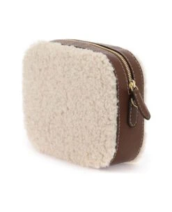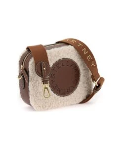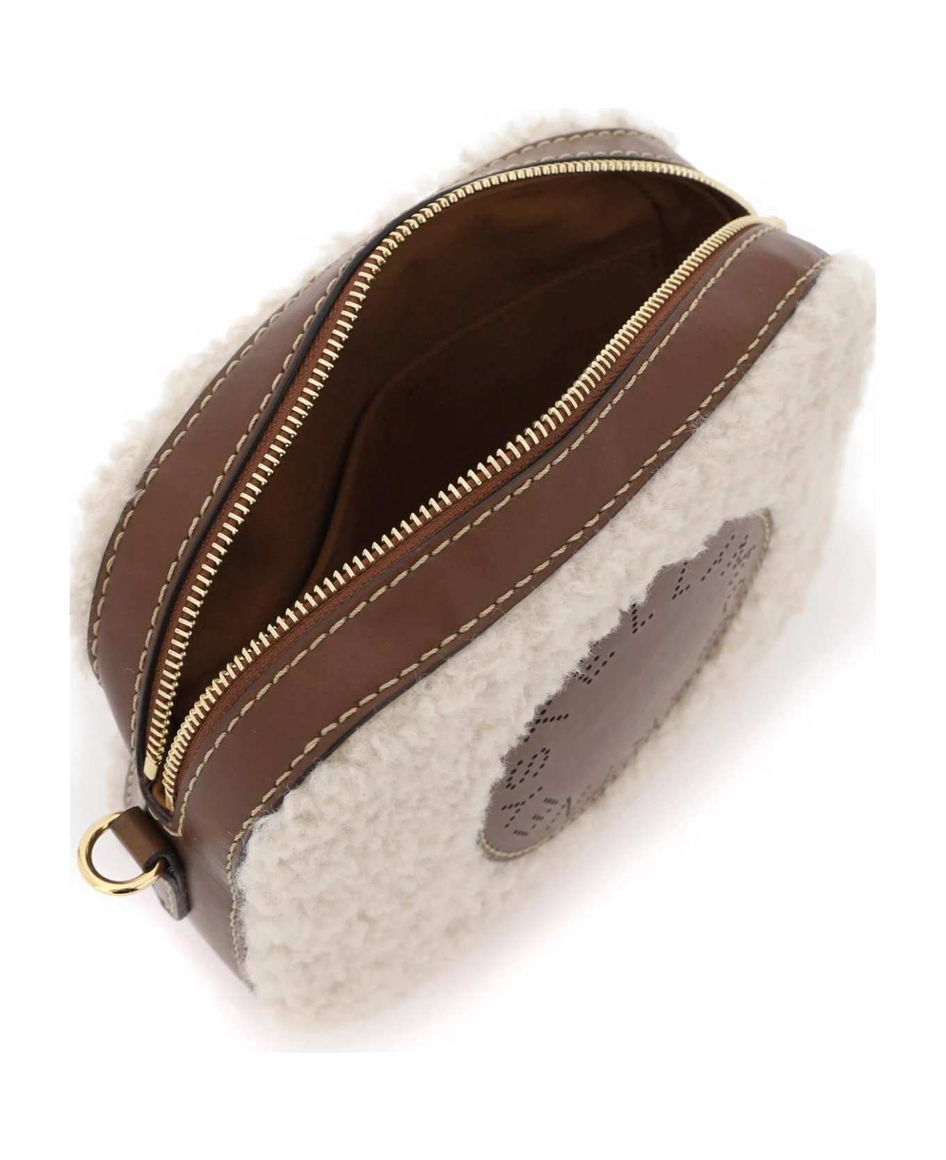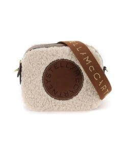 Stella McCartney camera bag in faux shearling with fauc leather logo patch. It features an adjustable and removable webbing strap with logo lettering in gold micro studs, zip closure, faux suede leather lining, one inner slip pocket. Gold-tone metalware.