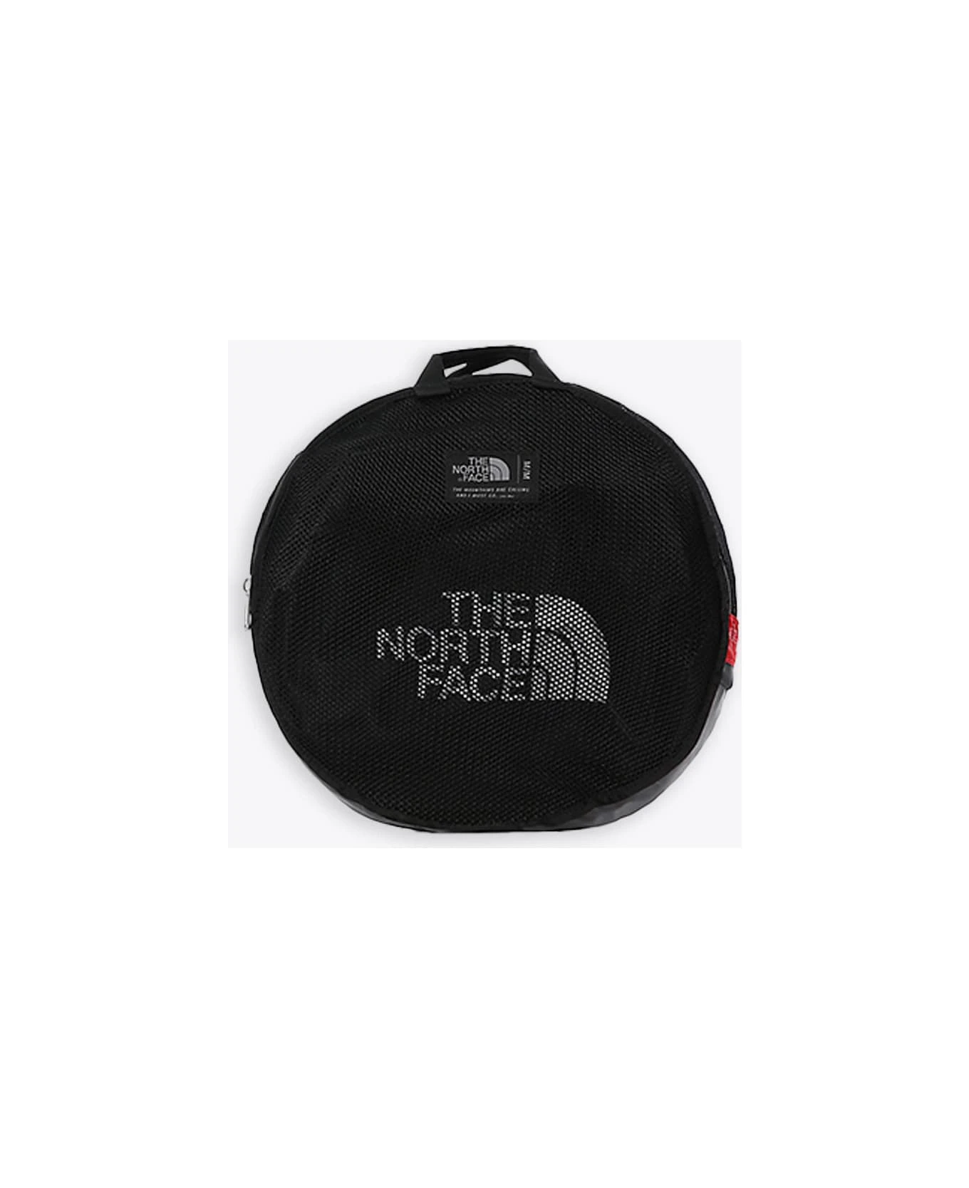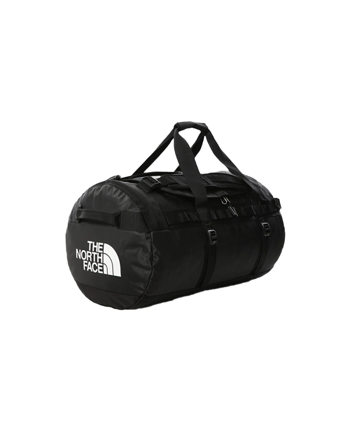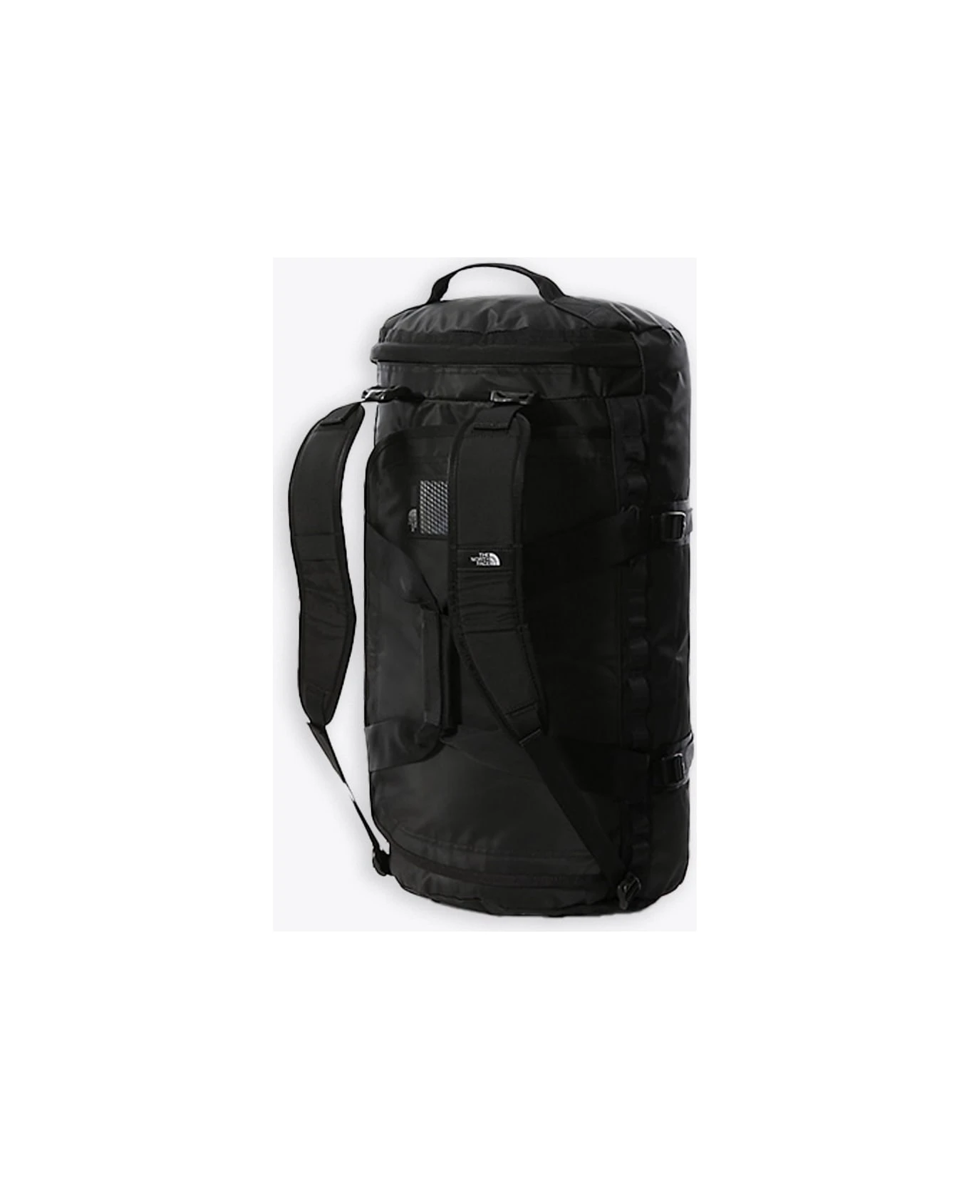 Black waterproof nylon duffle bag with removable and adjustable shoulder straps. Top padded handles. D-shaped opening with zip and flap. Main compartment with zipped mesh pocket. Four compression straps