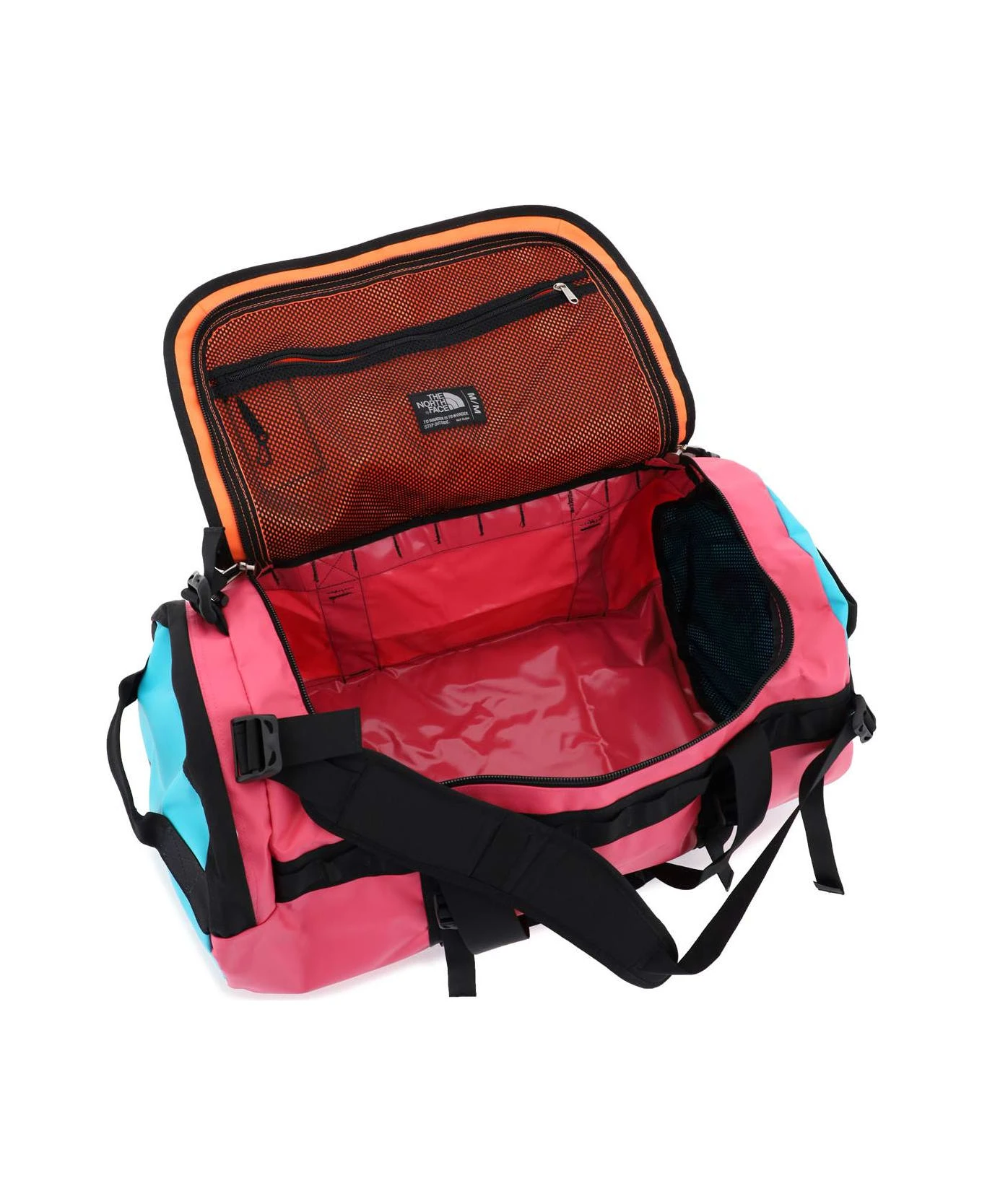 Base Camp duffel bag by The North Face made of water-resistant recycled materials featuring a two-way zippered closure. Unlined interior with a mesh pocket under the flap, side handles, compression straps, adjustable shoulder straps to wear it as a backpack, and transparent document pocket on top. Mesh bag included for easy storage.