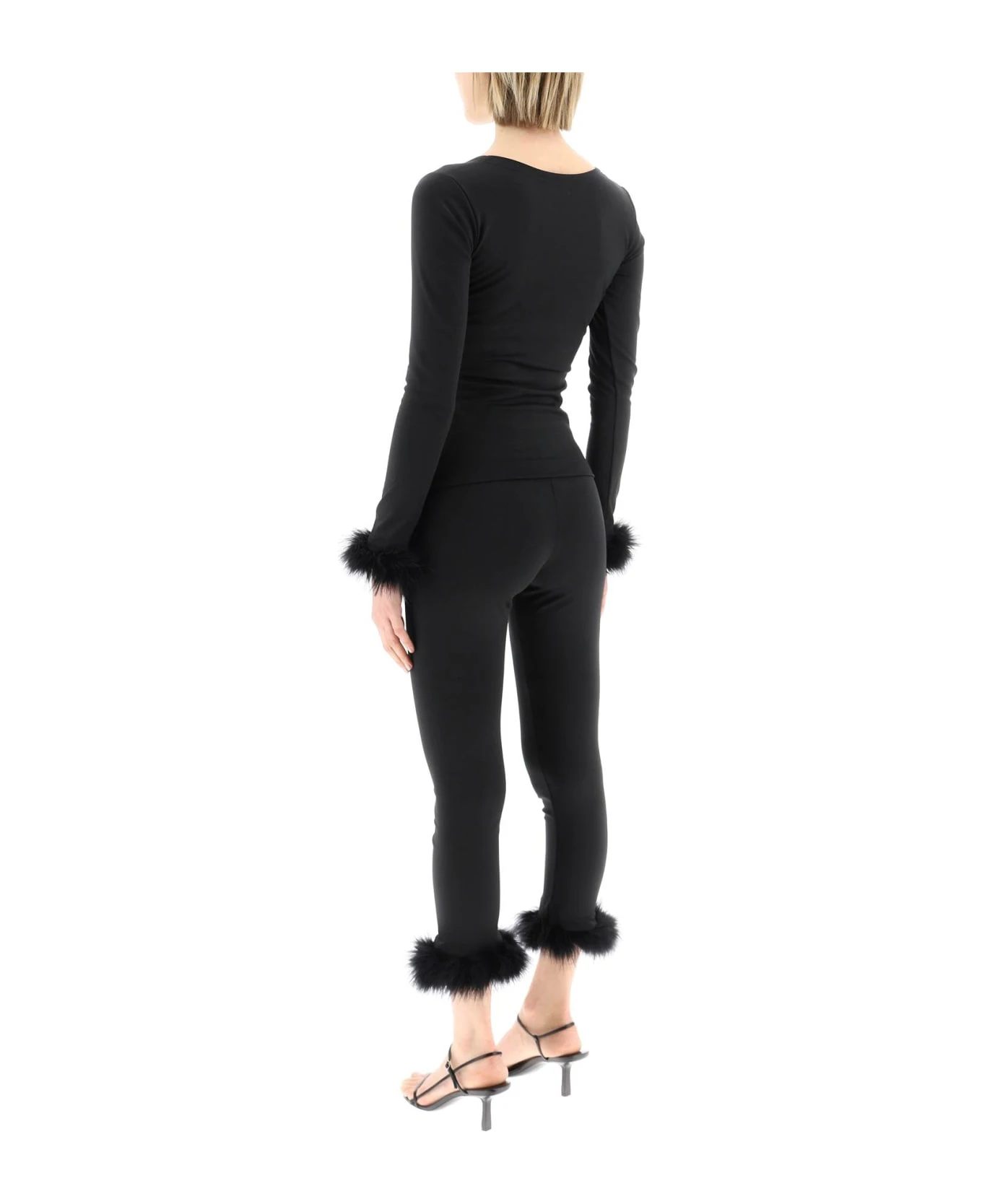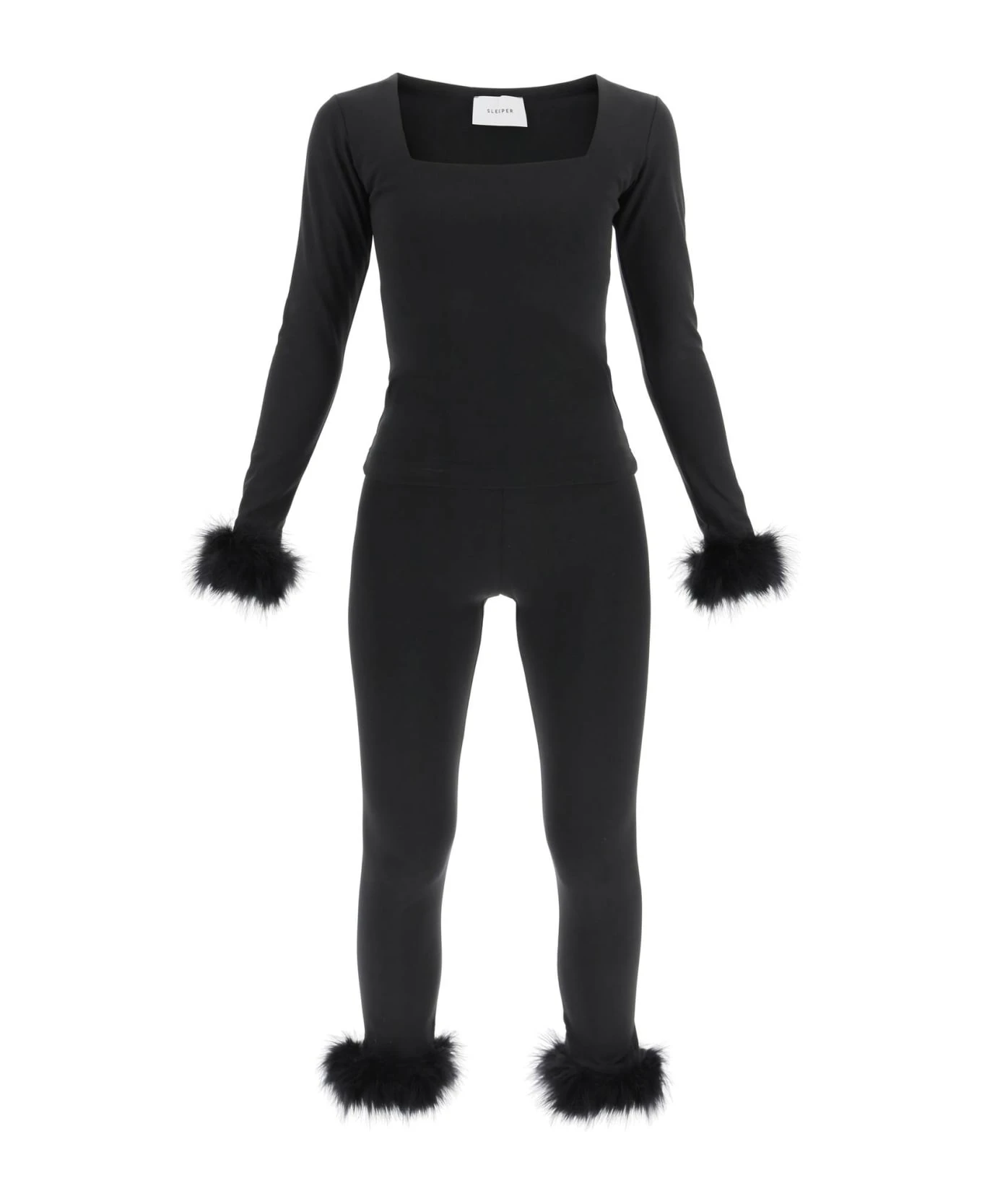 The Weekend Chic set by SLEEPER in recycled stretch jersey with removable ostrich details at cuffs. Long-sleeved top with squared neckline and cropped leggings with elasticated waist. The model is 177 cm tall and wears a size XS.