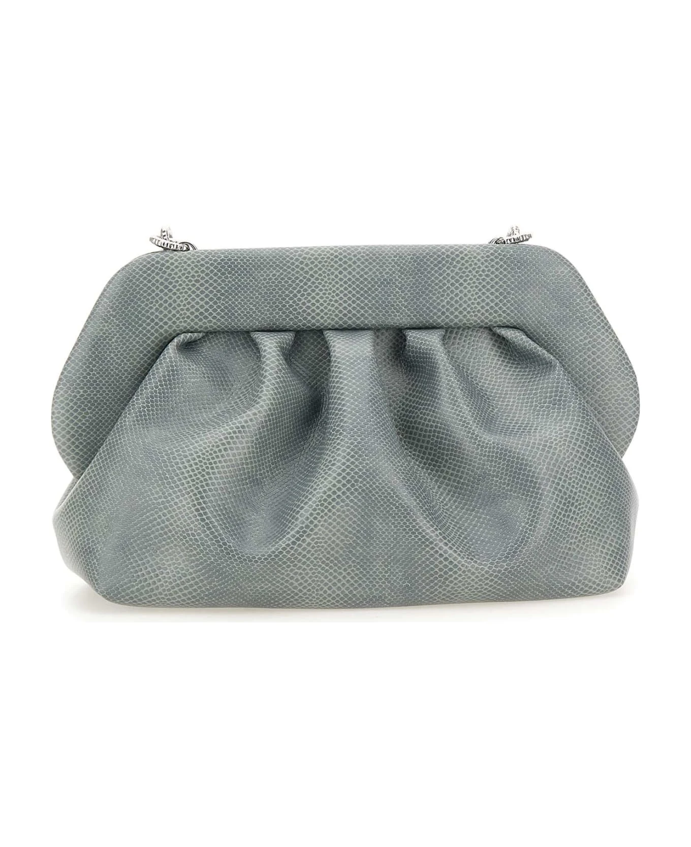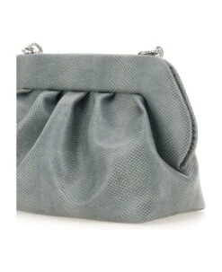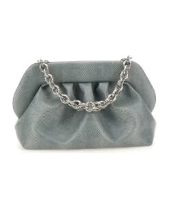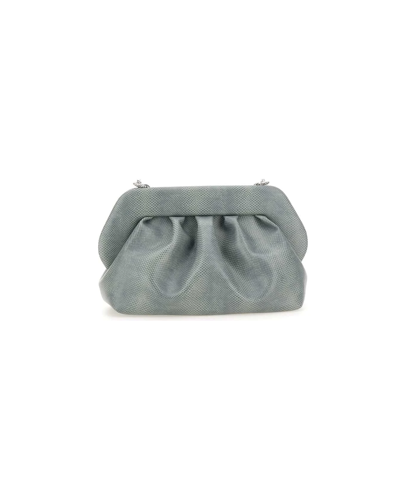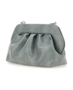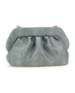 Themoirè women’s clutch bag “Bios Apple Snake”, in reptile-effect vegan leather, obtained with apple peels and cores from food industry waste, aqua green, silver chain top handle, removable and adjustable 100cm shoulder strap, top magnetic fastening. Dimensions: height 23cm, length 30cm, depth 9cm. Made in Italy.