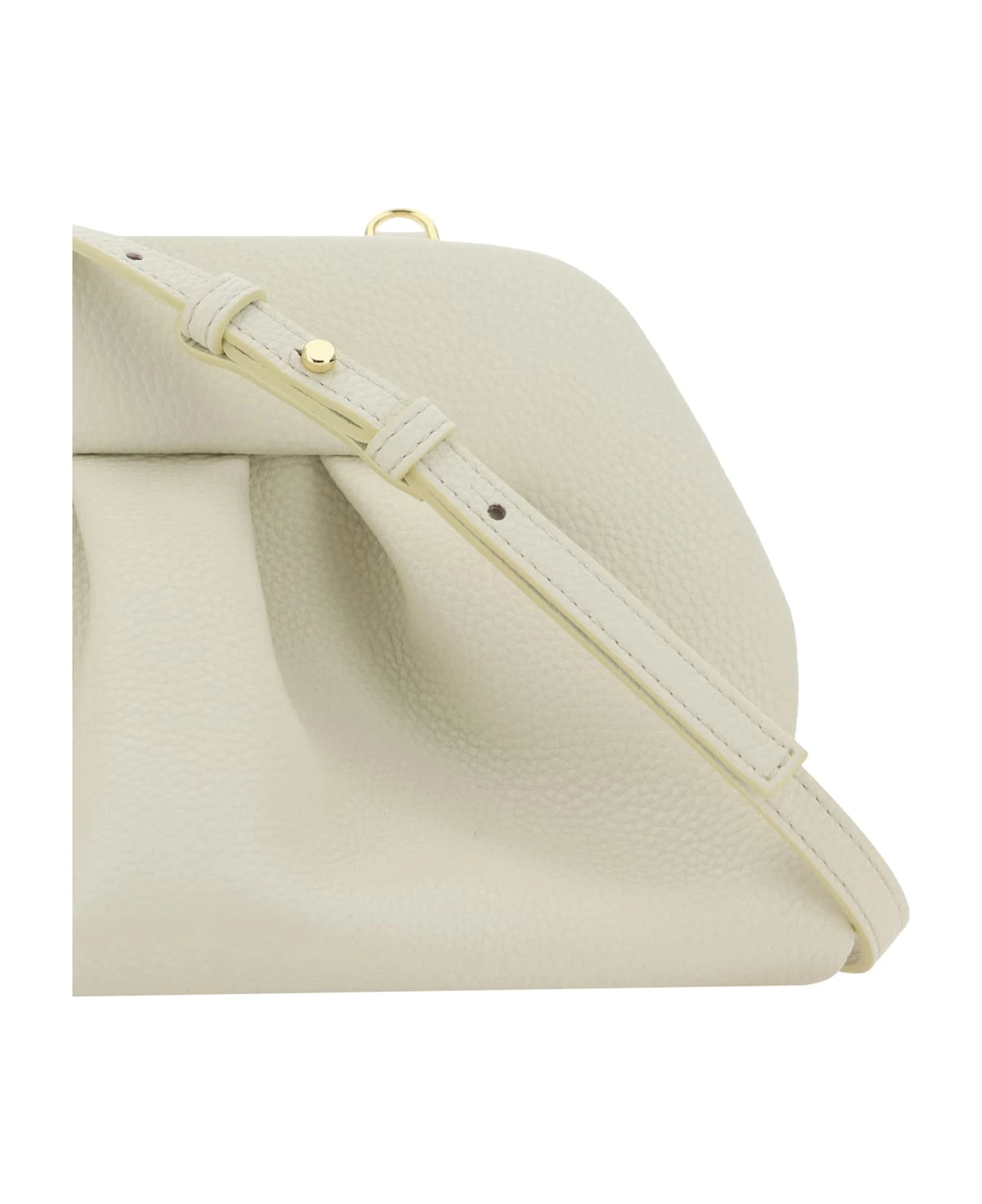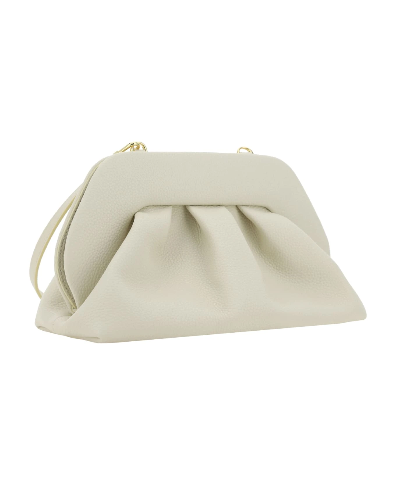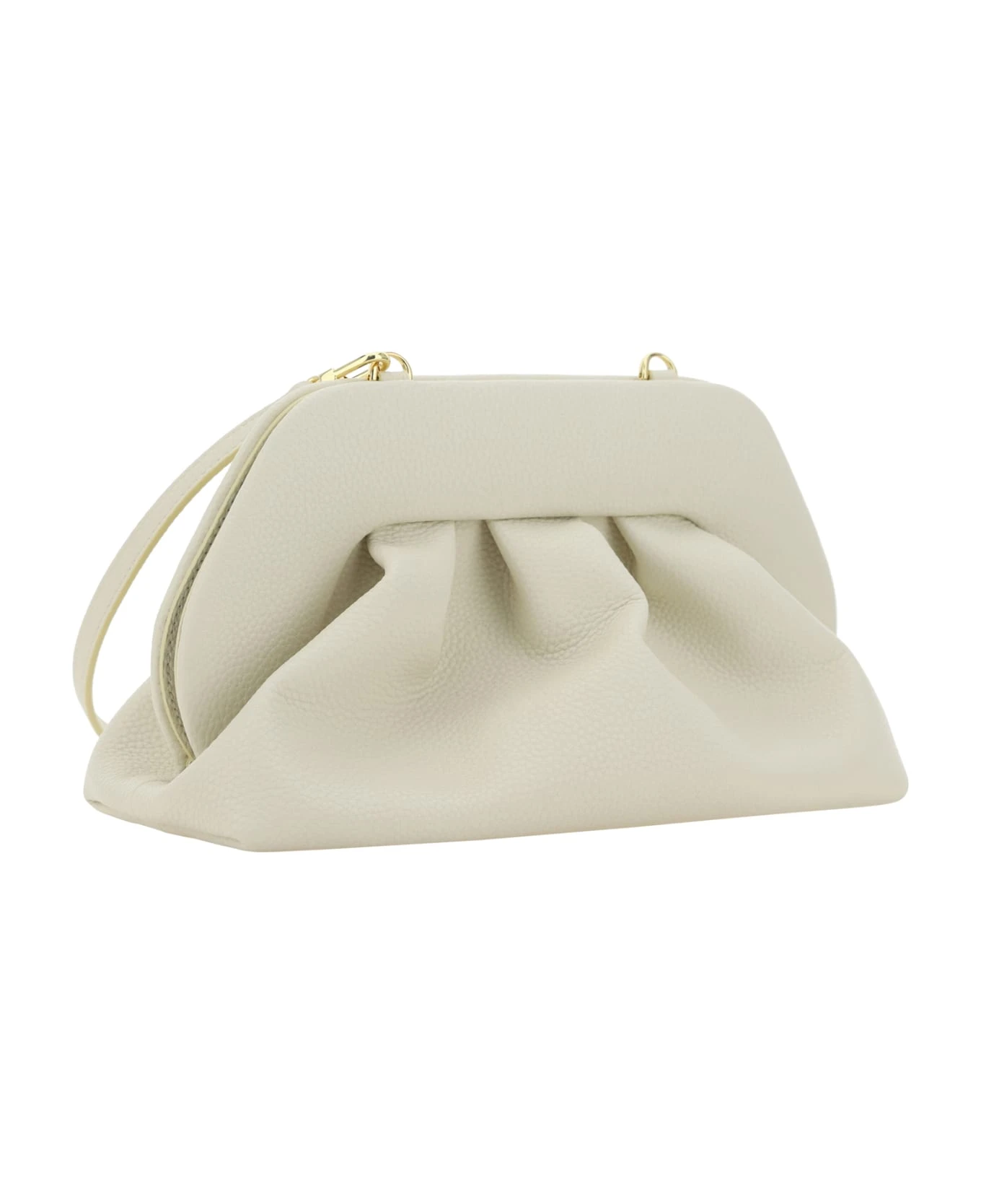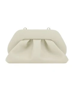 Tia bottalato clutch bag by themoir?, hand carry model, curled design, magnetic snap top closure, removable and adjustable flat vegan leather shoulder strap, recycled fabric interior lining.