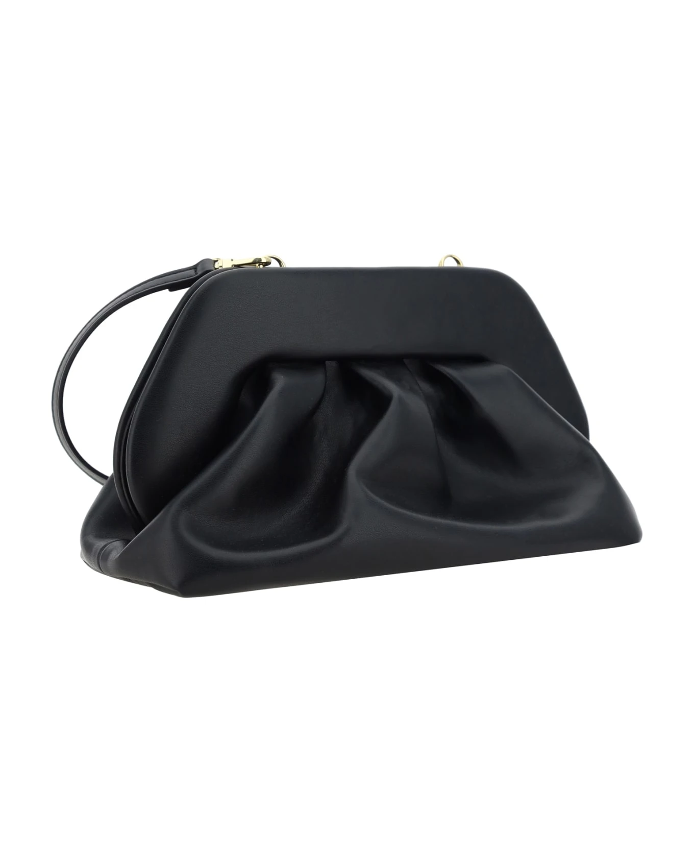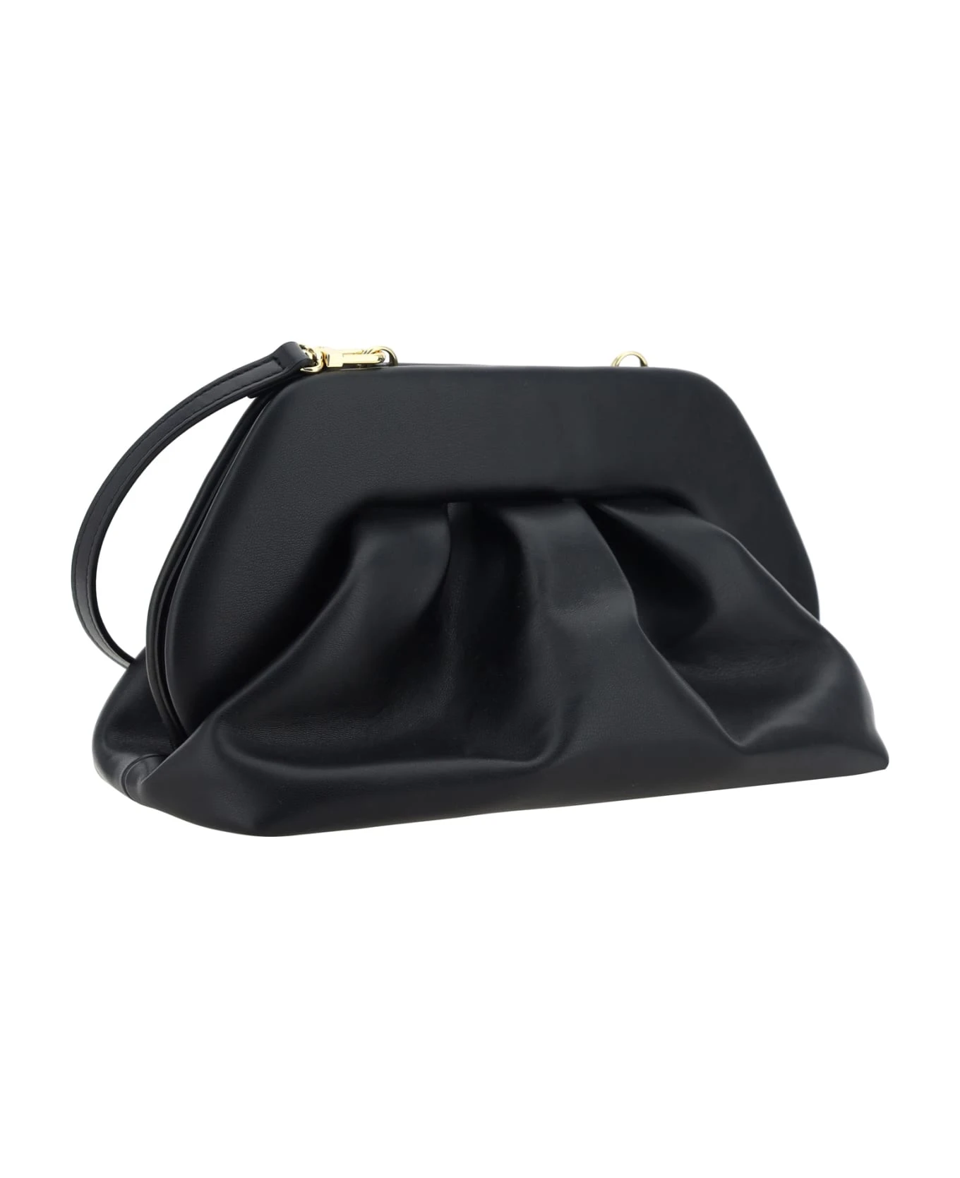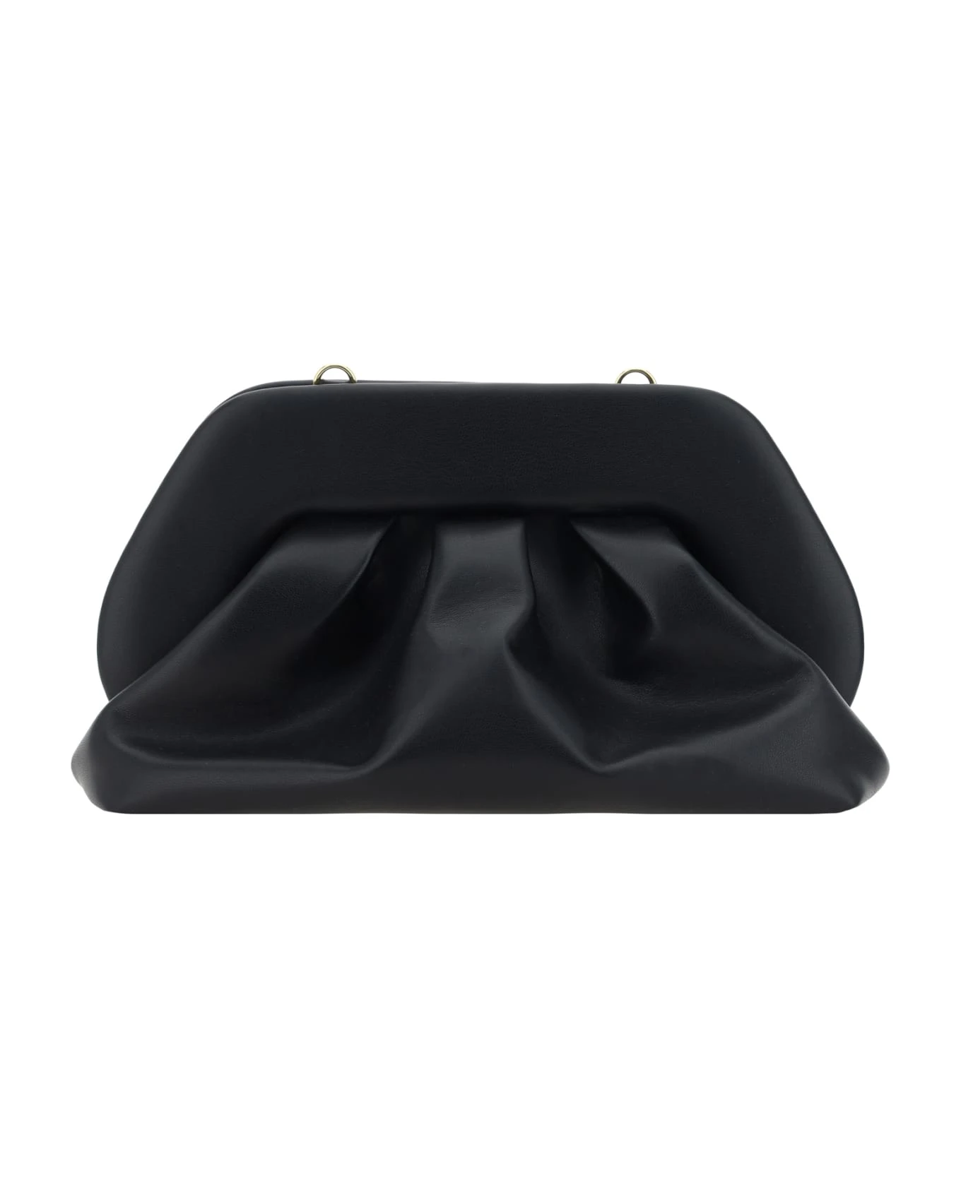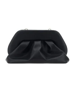 Tia clutch bag by themoirè, made of vegan leather, hand-carry model, curled design, magnetic snap top closure, removable and adjustable flat vegan leather shoulder strap, recycled fabric interior lining.