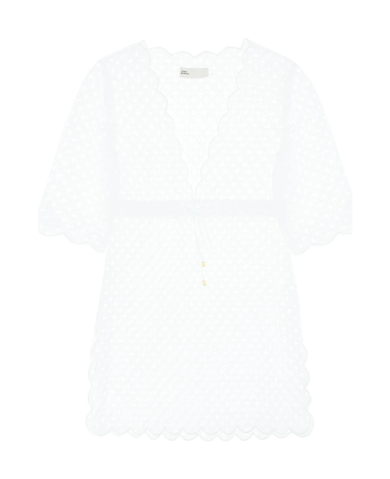 Tory Burch mini beach dress crafted in pure cotton broderie anglaise. Characterized by a tunic design, it features plunging V-neck, three quarter sleeves, drawstring empire waistline and side slits. Scalloped trims. Loose fit. The model is 177 cm tall and wears size S.