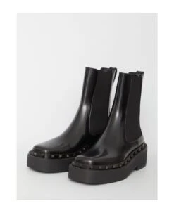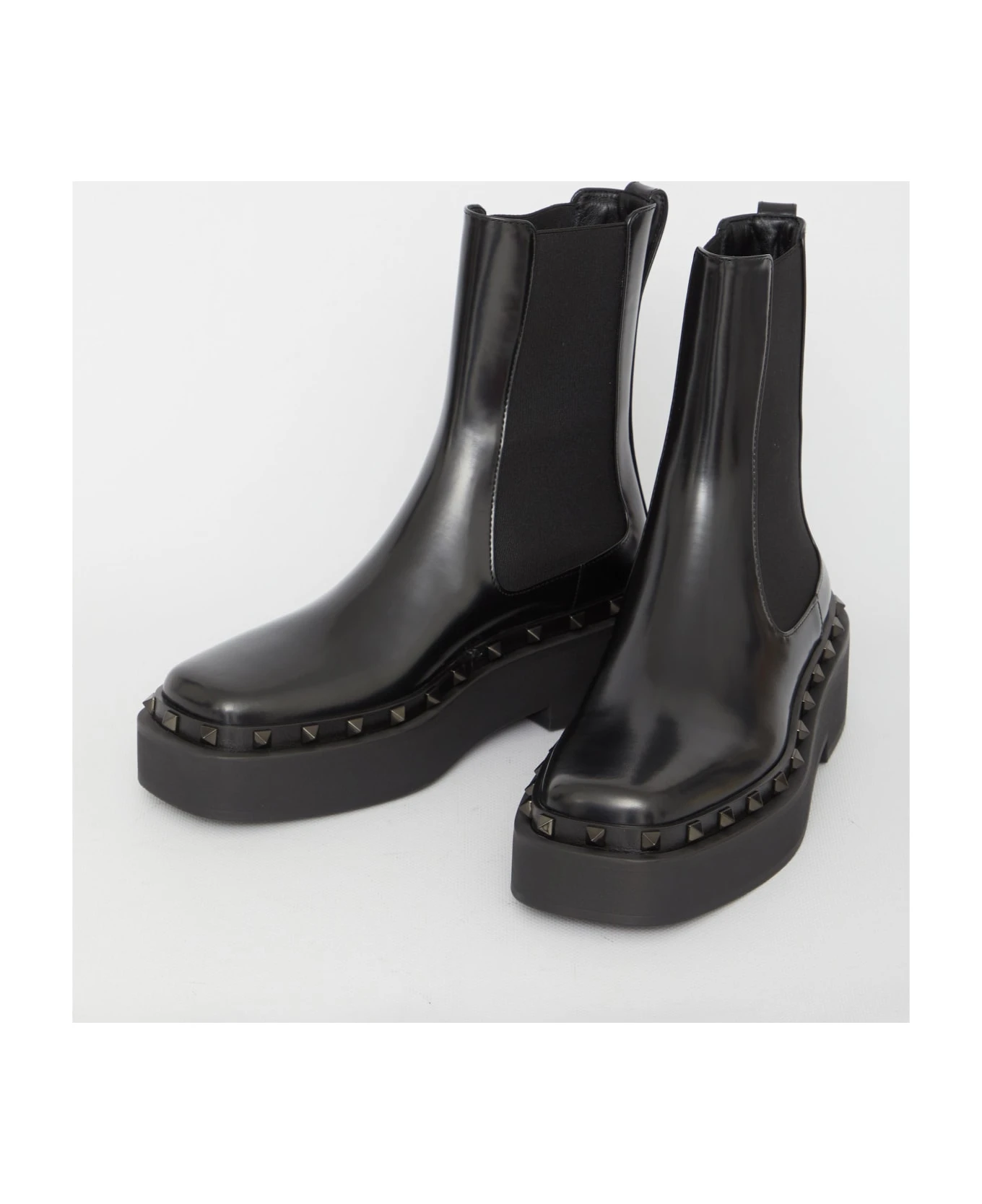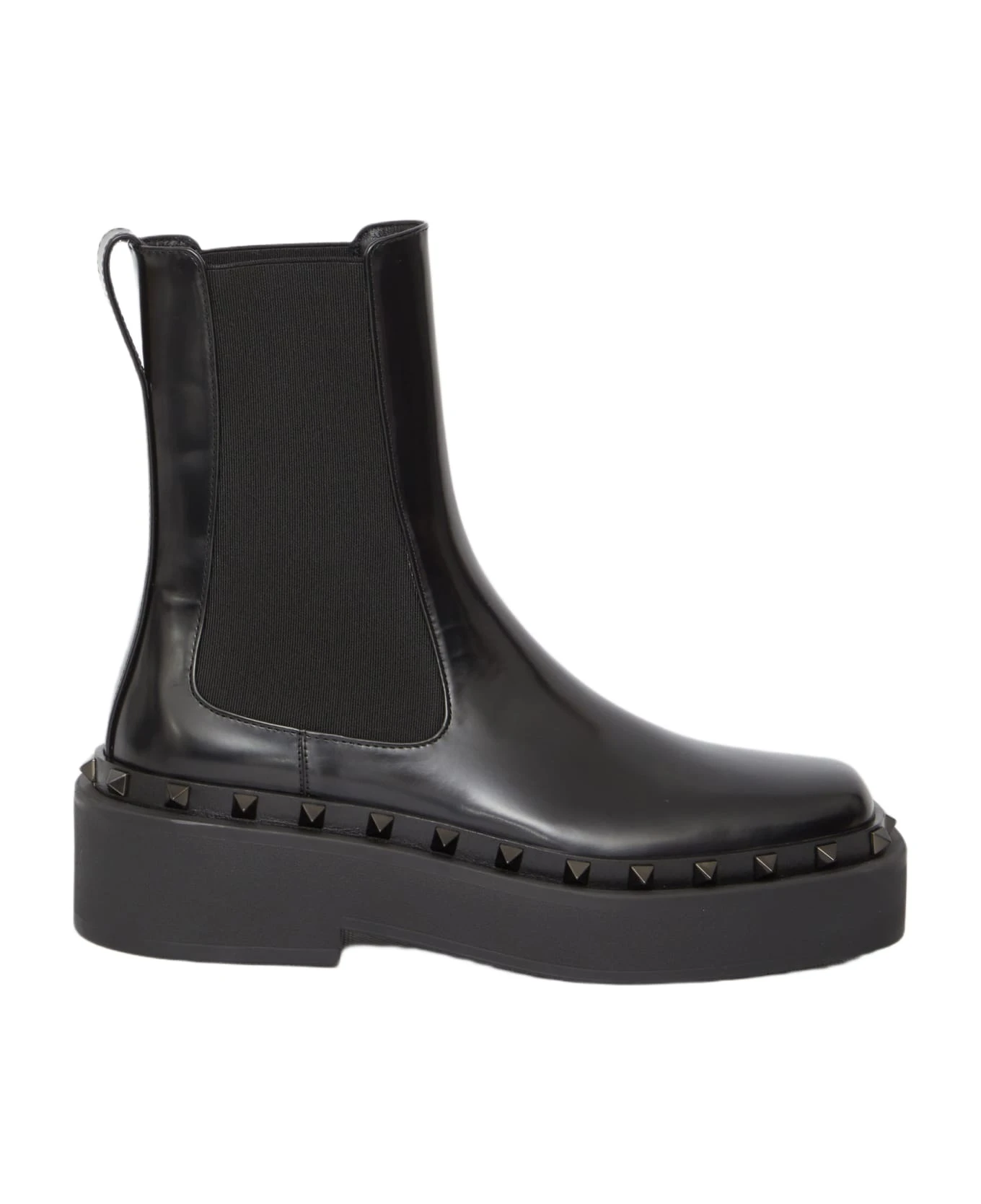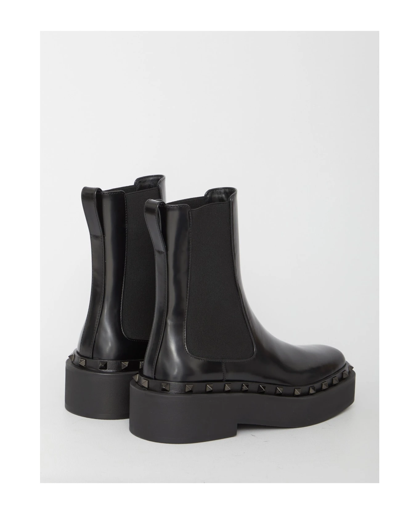 Valentino Garavani Beatle Rockstud M-Way boots in black calfskin with tonal studs. Side elasticated inserts. Leather and rubber sole.