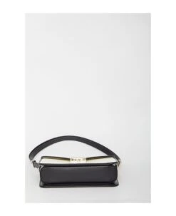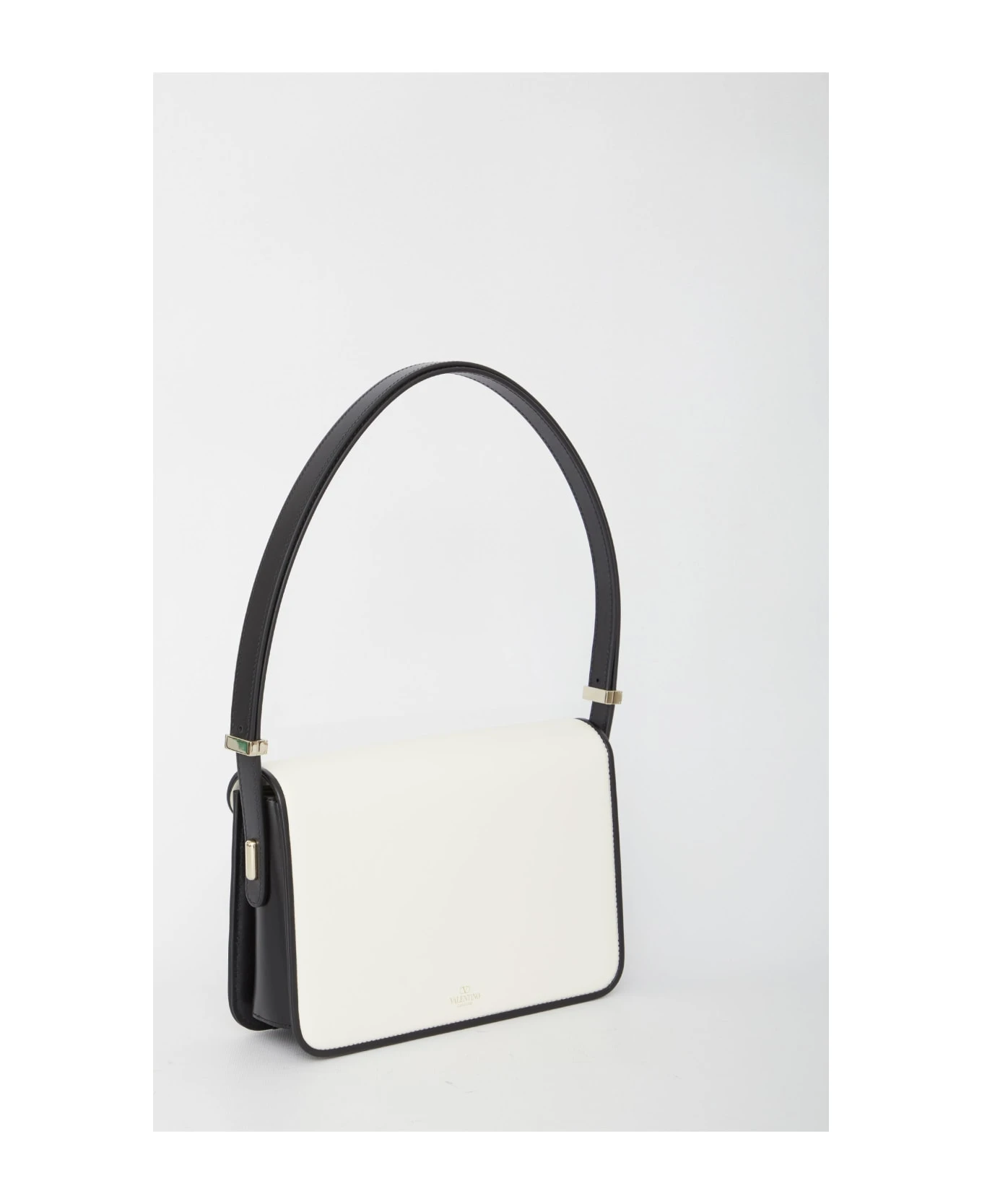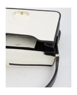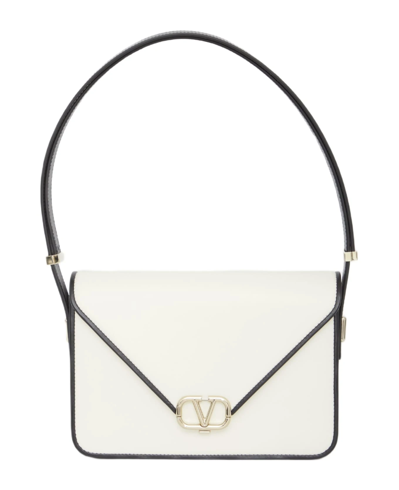 Valentino Garavani Letter Bag in cream-colored and black calfskin. It features top handle, VLogo Signature magnetic closure, one main interior compartment and one interior card slot.