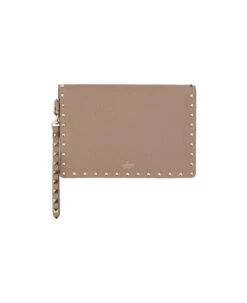 Calfskin rockstud medium pouch by valentino garavani, front magnetic button closure, removable leather puller, iconic brand studs applied in all-over contrast, iconic brand monogram printed on the back.