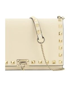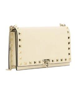 Calfskin rockstud shoulder bag by valentino garavani, grained leather design, beading with the brand’s iconic studs applied to the front and back, front fastening by means of a pivot, iconic brand monogram printed in pressure and contrast on the back, leather shoulder strap and removable chain.