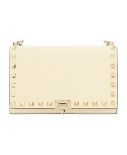 Calfskin rockstud shoulder bag by valentino garavani, grained leather design, beading with the brand’s iconic studs applied to the front and back, front fastening by means of a pivot, iconic brand monogram printed in pressure and contrast on the back, leather shoulder strap and removable chain.