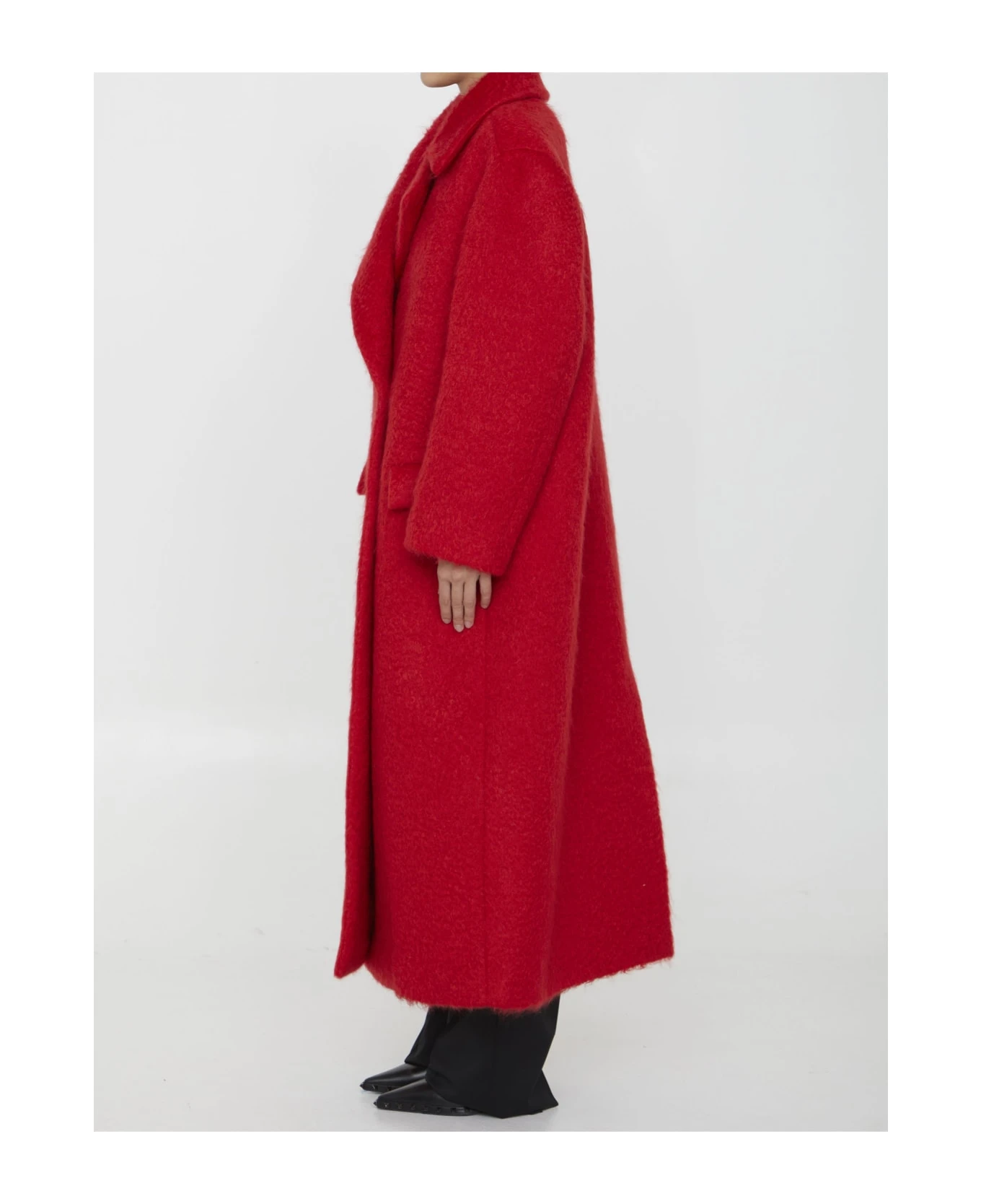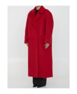 Valentino coat in red Uncoated Bouclé. It features classic lapels, double-breasted front closure with press-studs, two side welt pockets, two front faux flap pockets and back slit. Oversized fit.