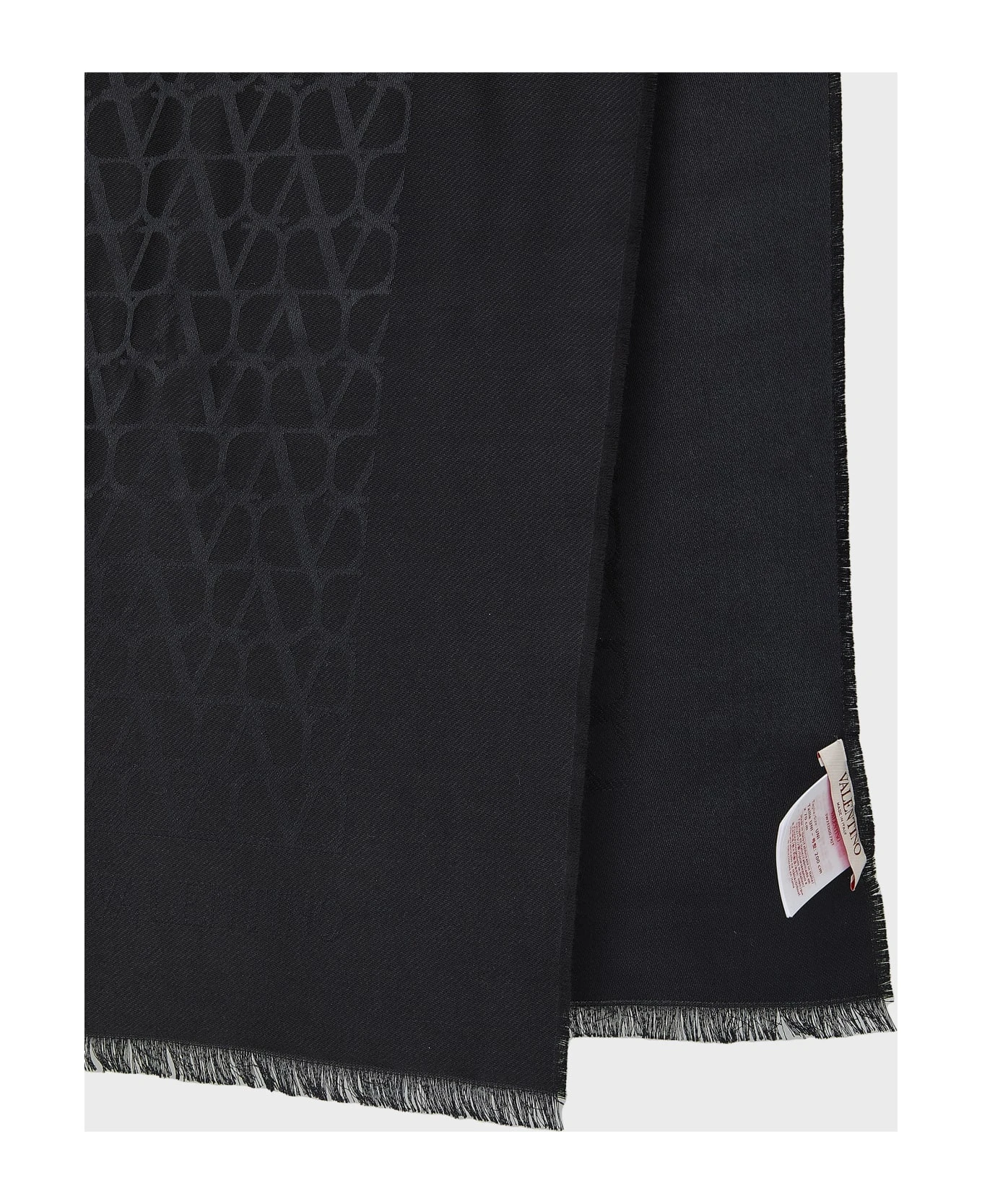 Scarf in soft black silk and wool with all-over tonal VLogo Signature motif. Fringed hems.