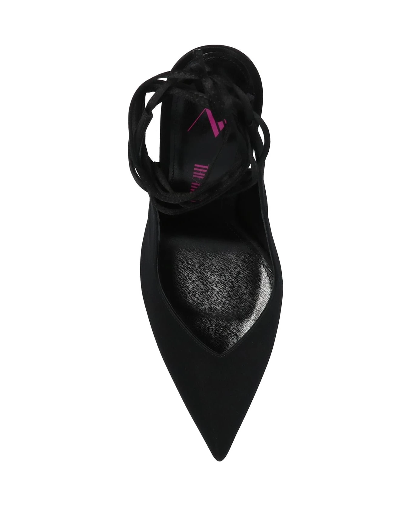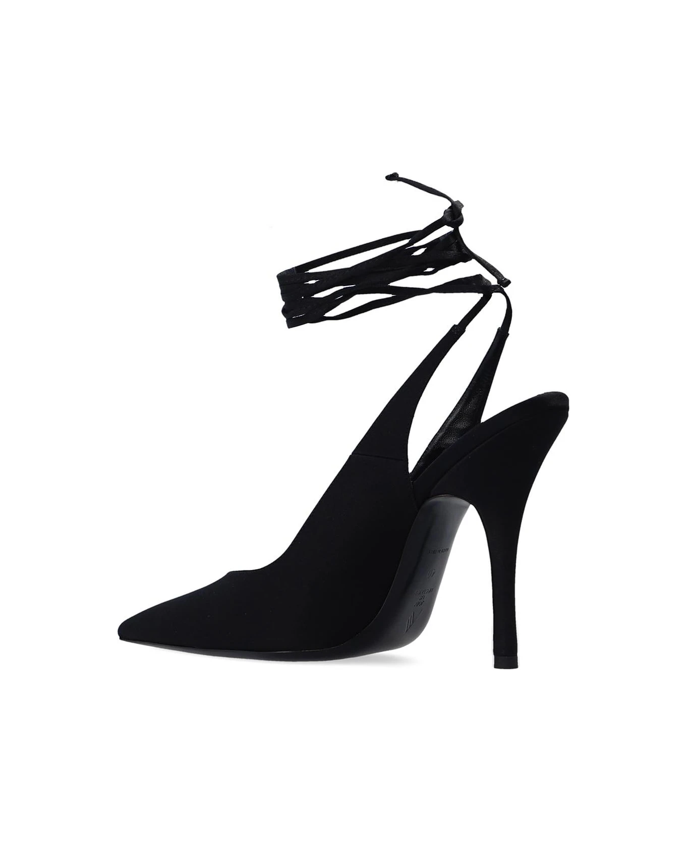 Black ‘Venus’ pumps from The Attico. Crafted from leather and fabric, this pair sits on a black leather sole and features a pointed toe silhouette and an ankle tie fastening.
