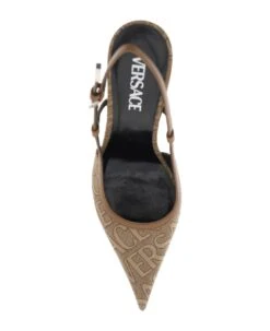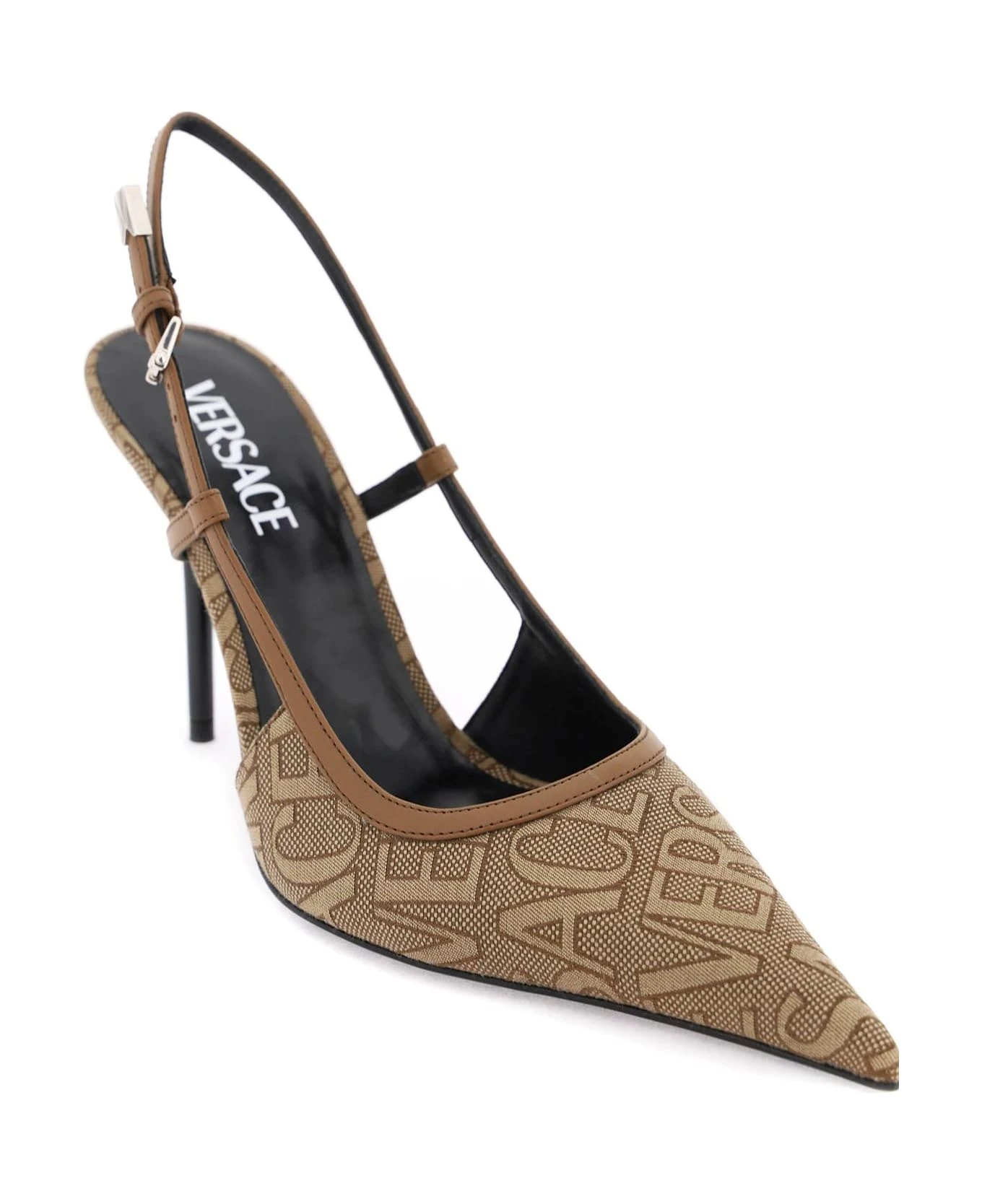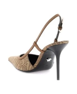 Versace slingback pumps with Versace Allover jacquard upper and tone-on-tone leather trims. Adjustable ankle strap, leather footbed, stiletto heel and leather sole.