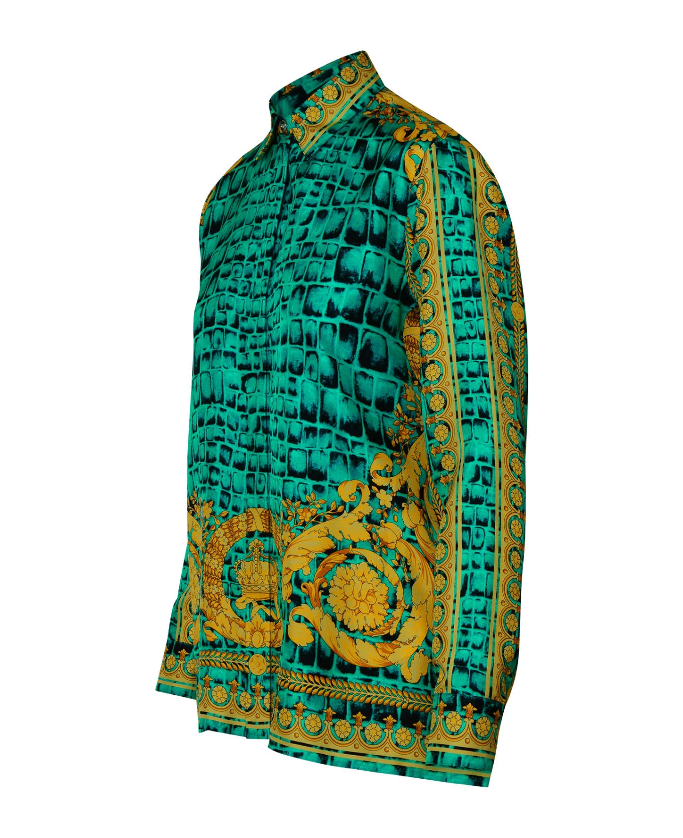 All-over ‘Baroccodile’ print, pointed collar, hidden button cannon, ‘Medusa’ button cuffs