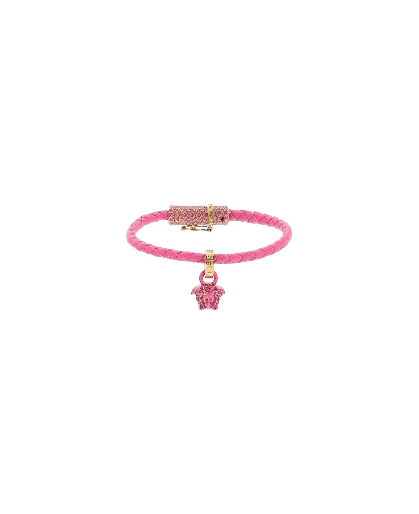 Braided leather bracelet by Versace with Medusa charm and magnetic closure embellished with tone-on-tone crystals. The item in photo is size M.