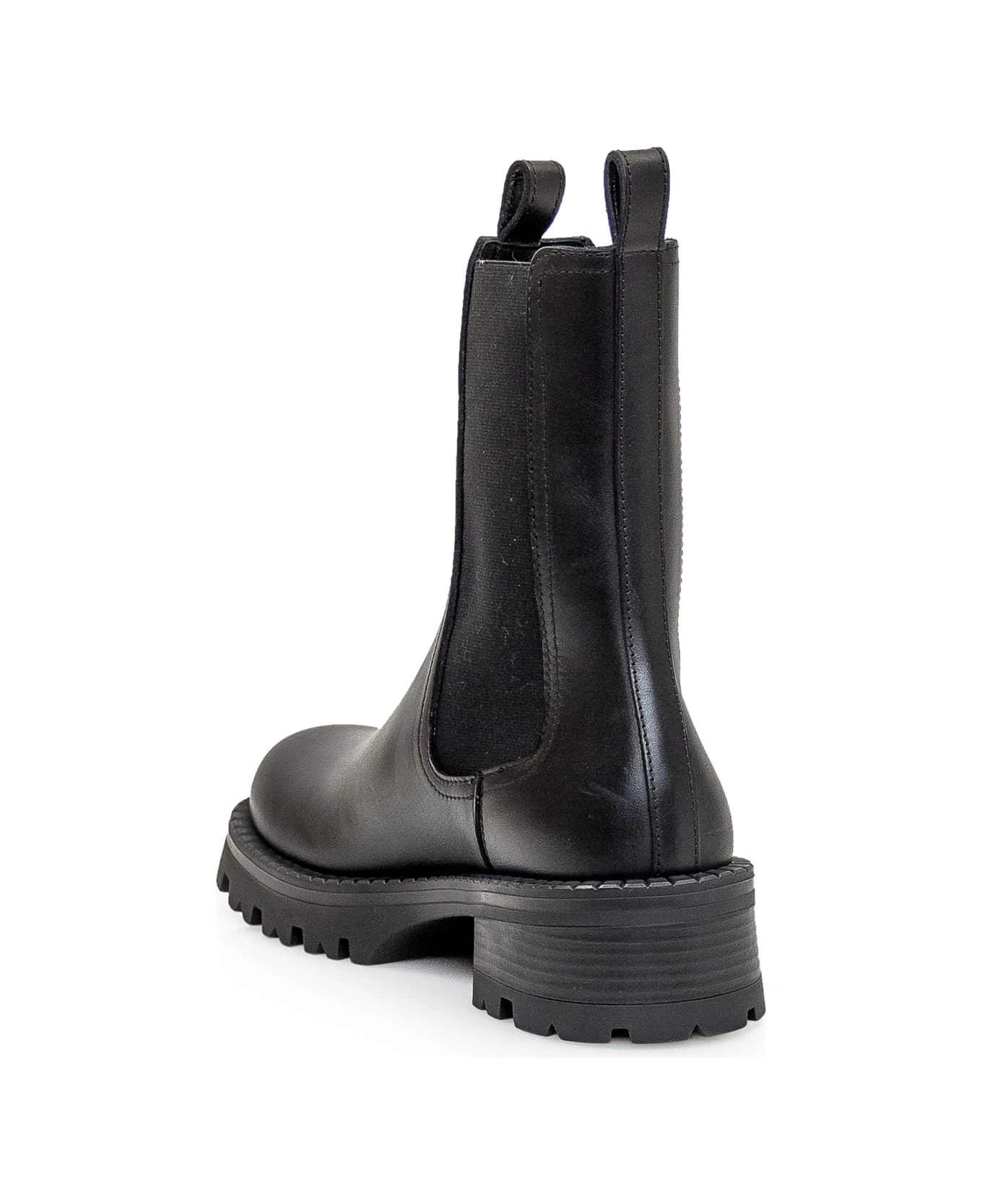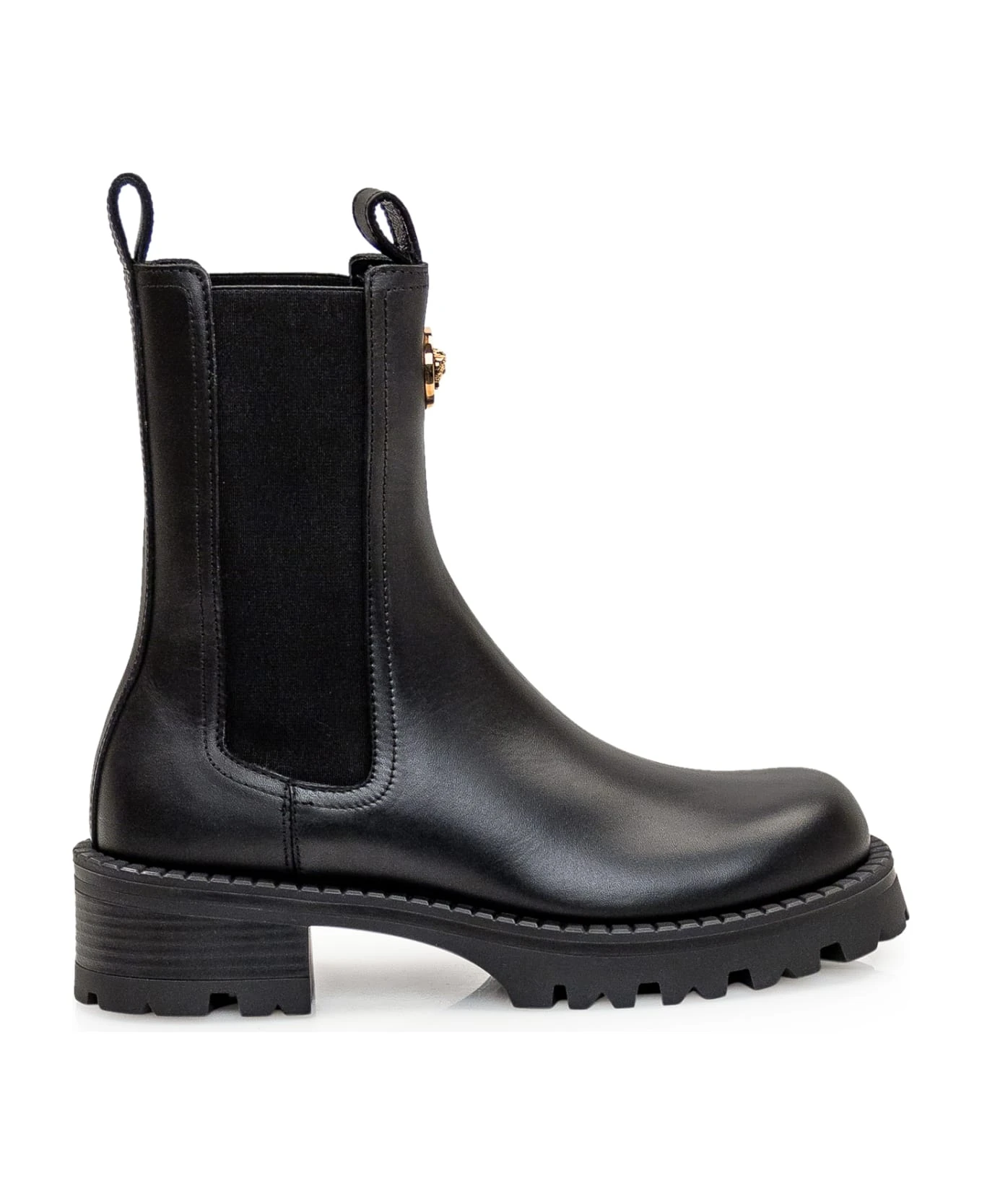 Black leather boots. Slip-on. Stretch inserts. Round toe. Golden Medusa logo on the front