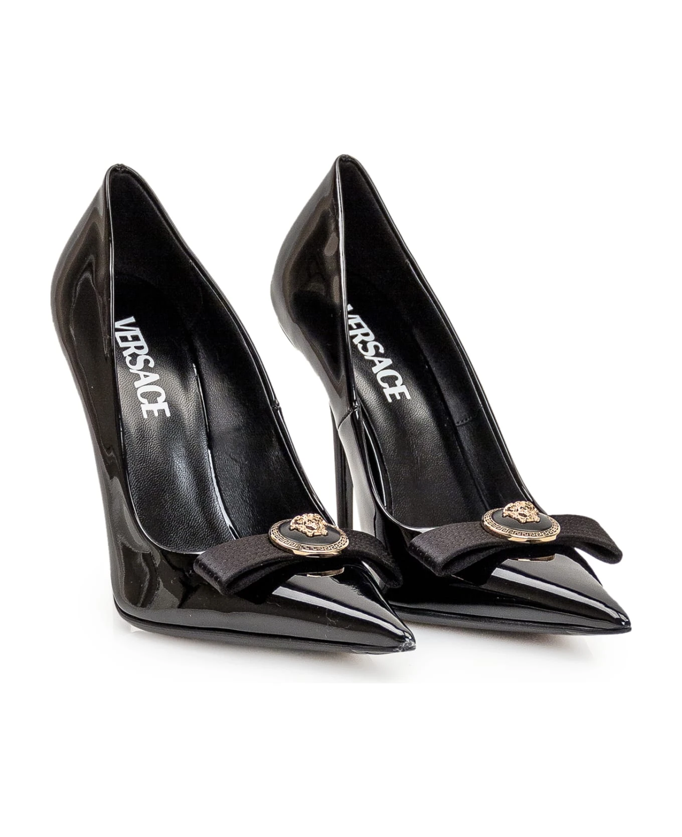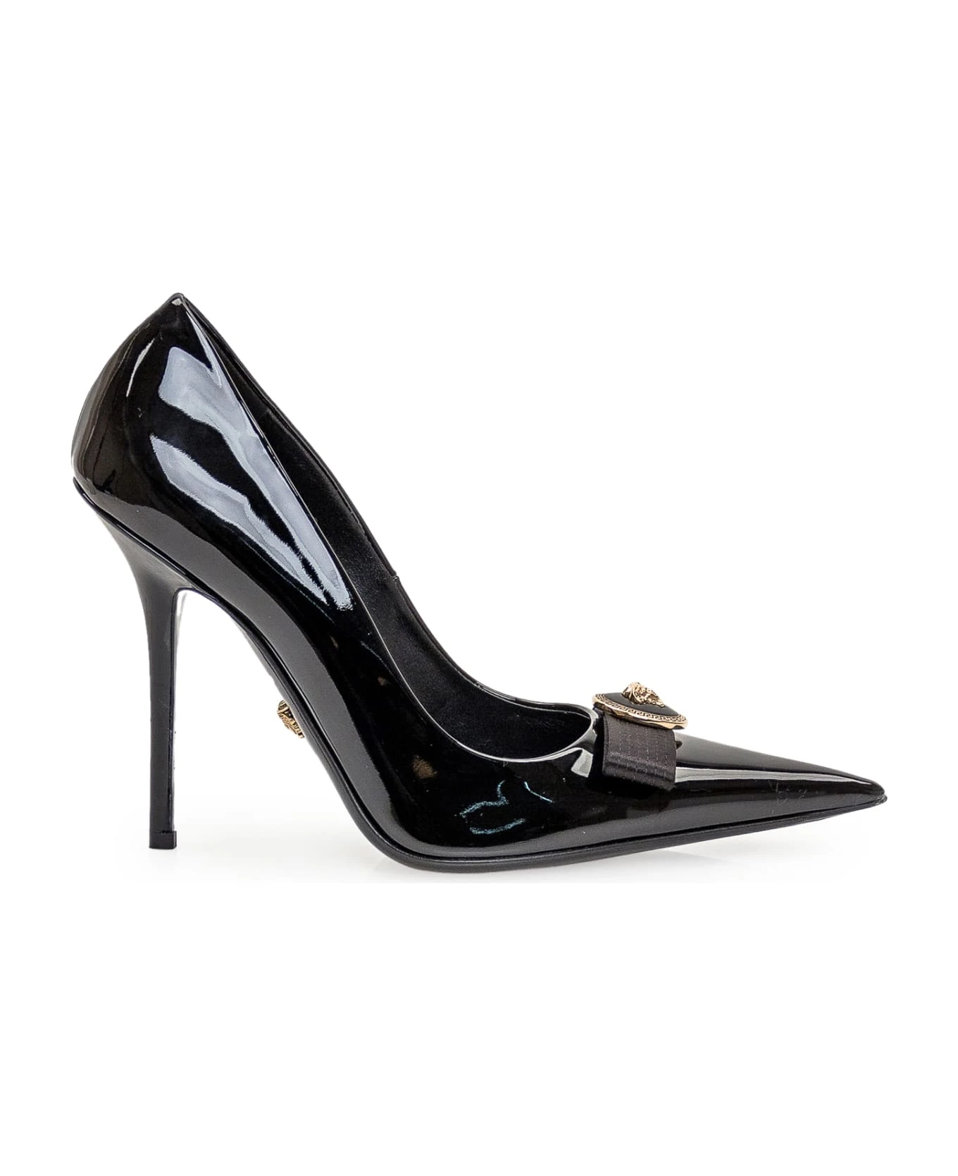 Black patent leather pump. Bow with Medusa ’95 logo on the front. Stiletto heel. Versace logo on the insole.