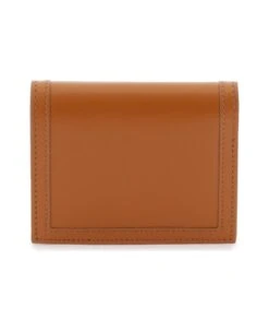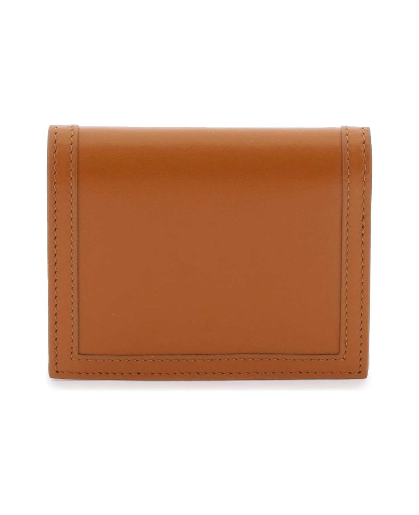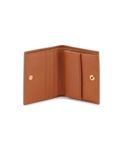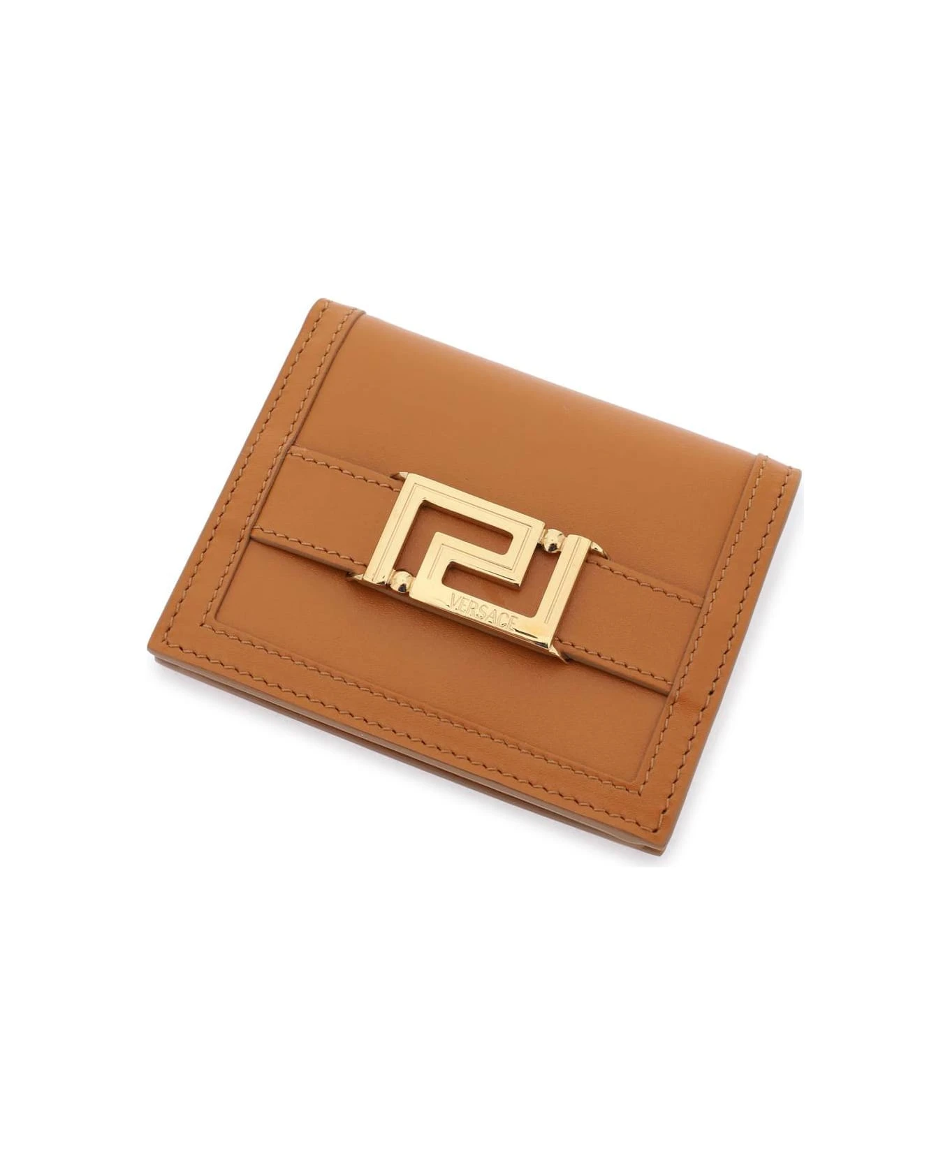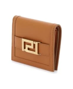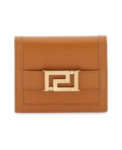 Leather wallet by Versace with iconic Greca Goddess in gold-plated metal. Interior with one bill compartment, ina coin pocket and three credit card slots.
