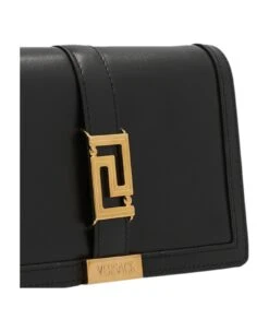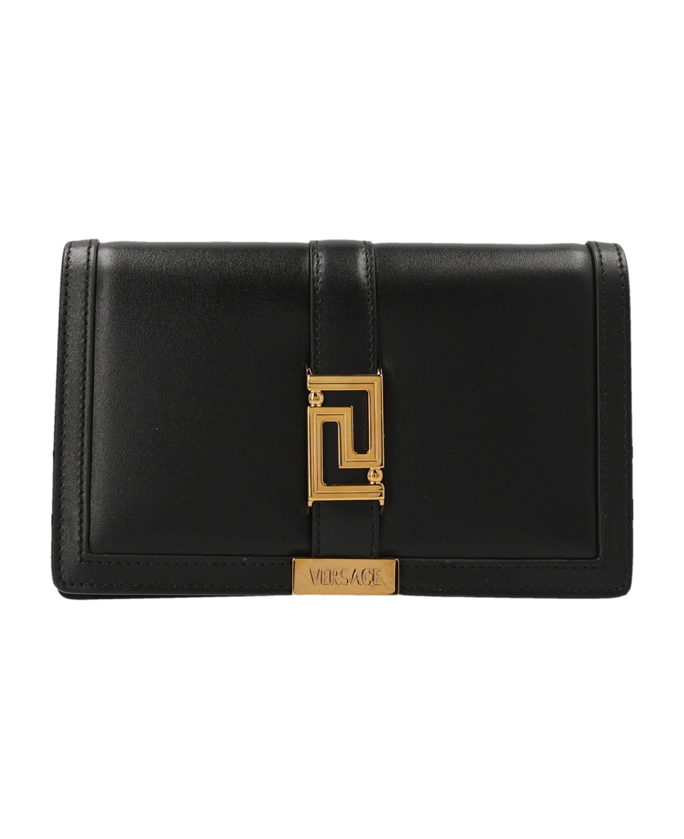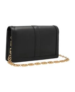 ‘Greca Goddess’ leather clutch bag with snap button closure, Greca hardware, removable chain shoulder strap and zip closure.
