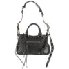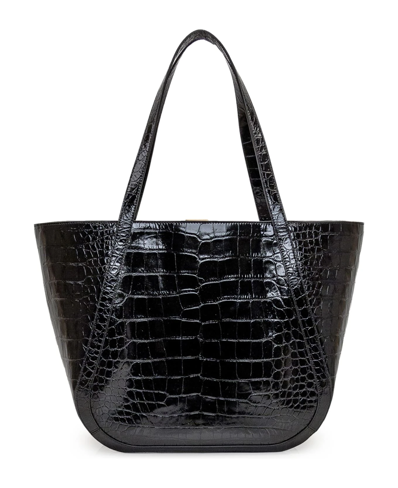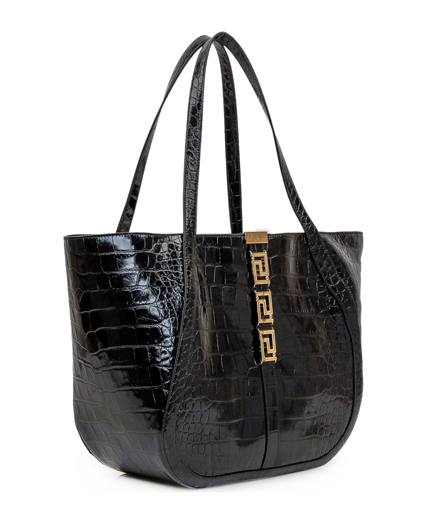 Black leather Shopper bag with crocodile effect. Two handles. Inner pocket with zip. Magnetic closure. Chain with golden Greek on the front. Golden logo on the front.